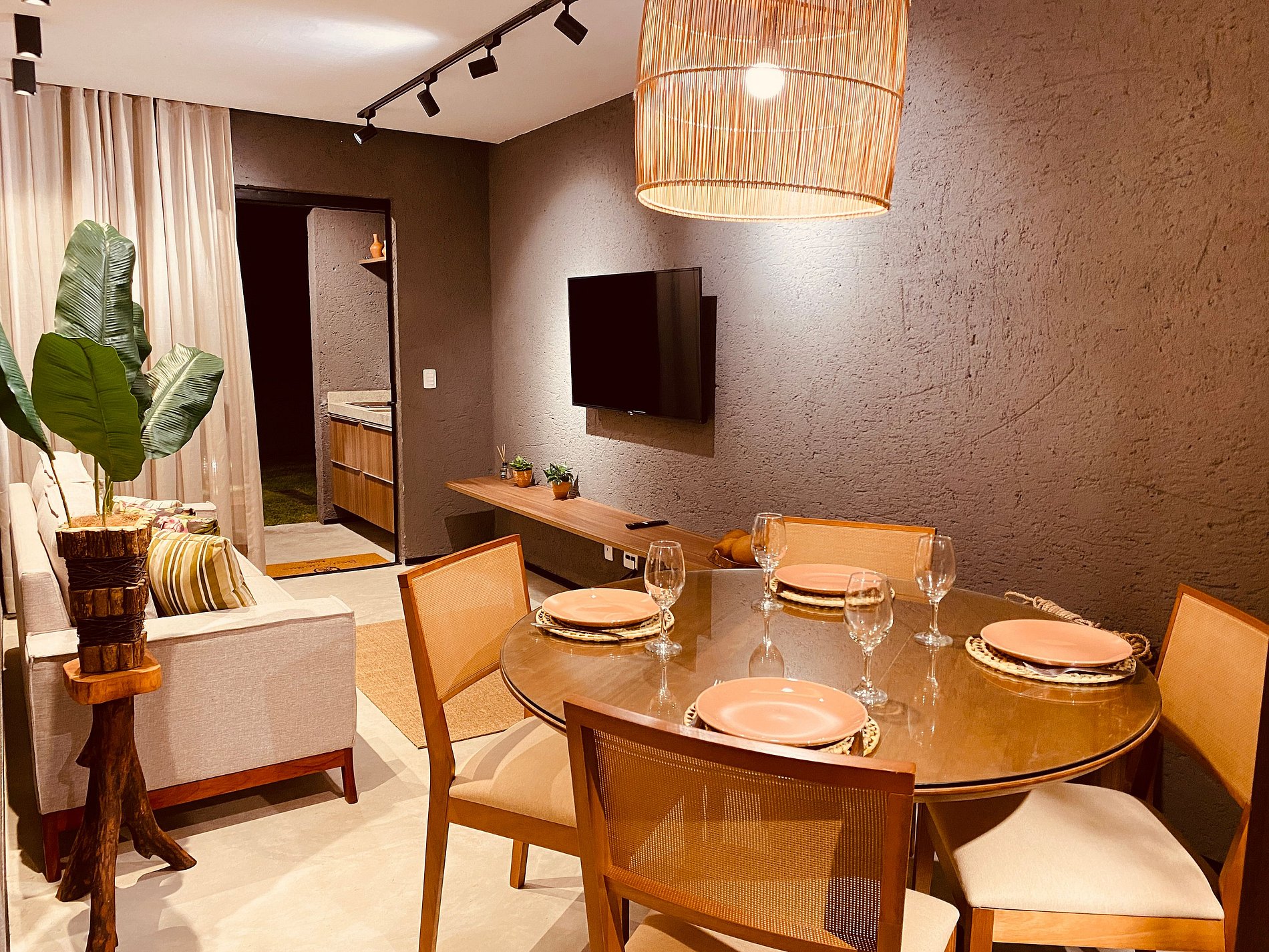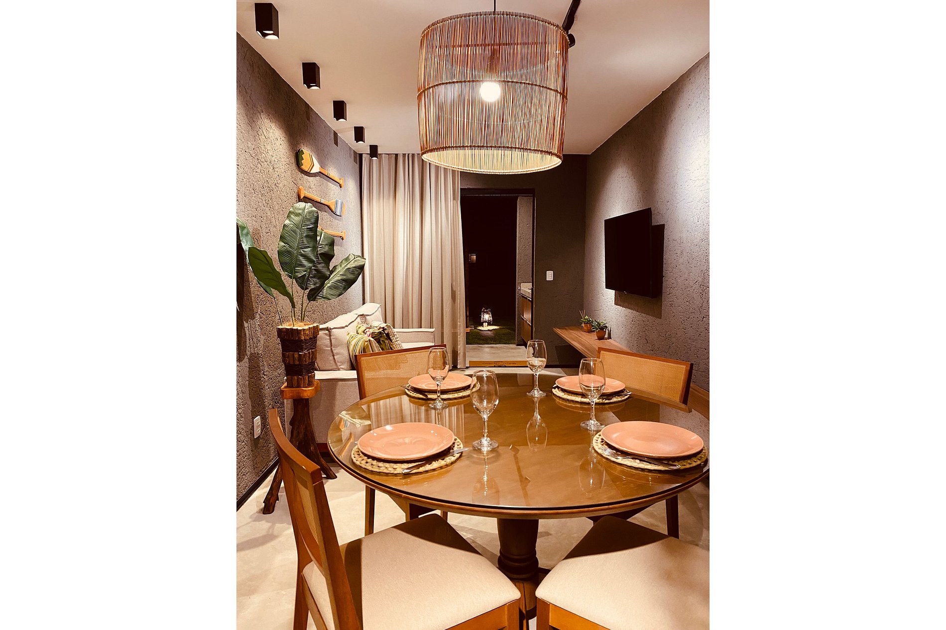 Possui 59m2, sendo 2 suítes, sala de estar com varanda gourmet, cozinha, área de serviço e 01 vaga privativa