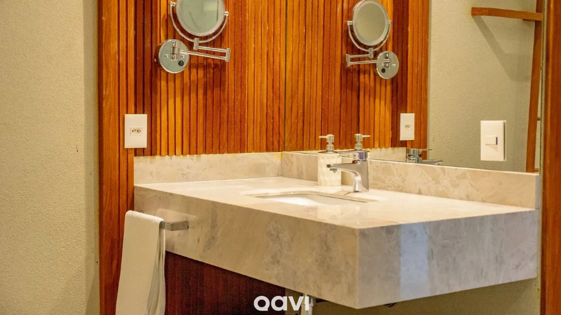 - Quarto: 1 cama de casal king, 1 sofá, Smart TV, mesas de cabeceira, cofre eletrônico, ar-condicionado e suporte de malas.