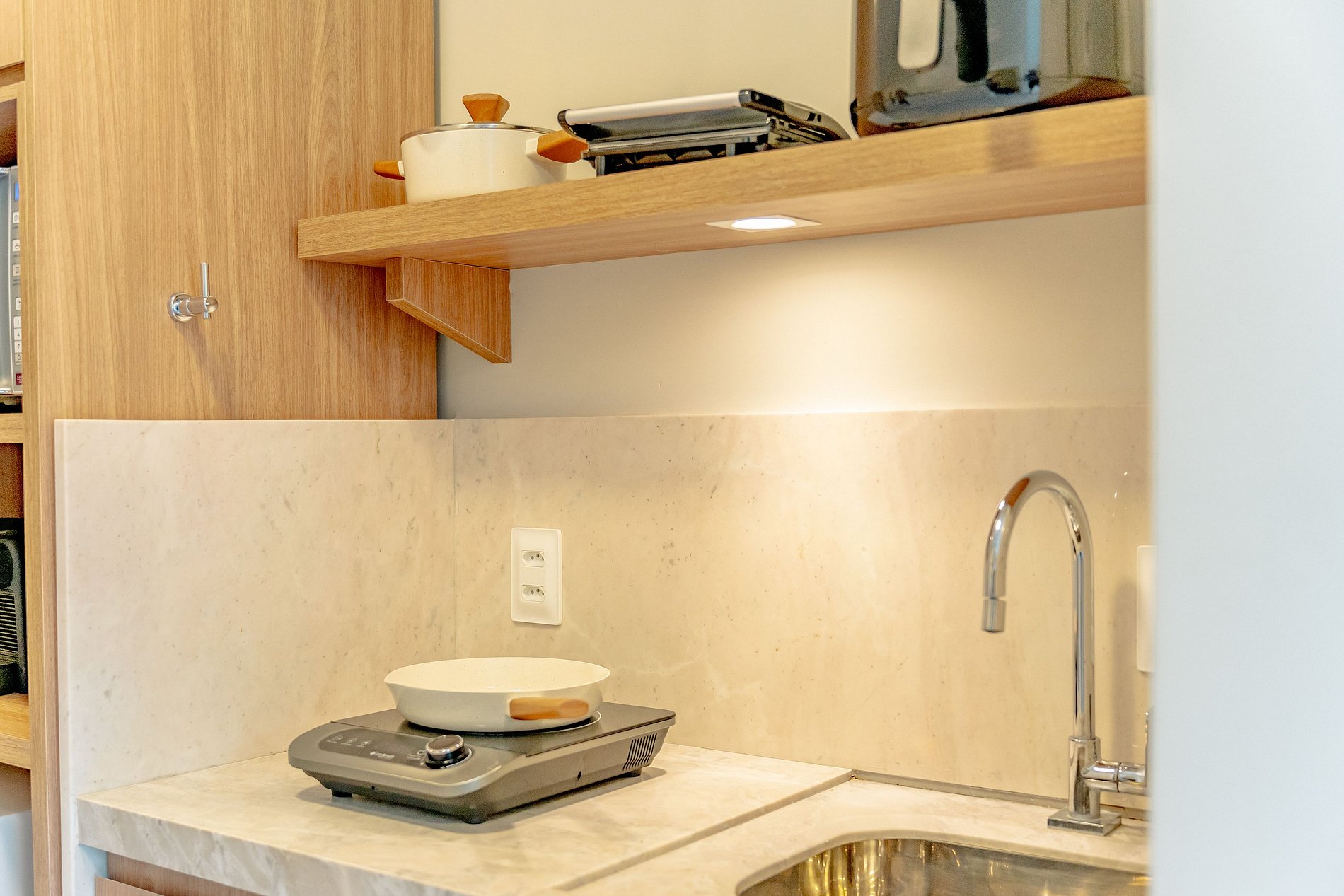 Compact kitchen: equipped with a mini-fridge, portable stove, AirFryer, microwave, electric coffee maker, toaster/mixer, cutlery set, pots, plates, and glasses.