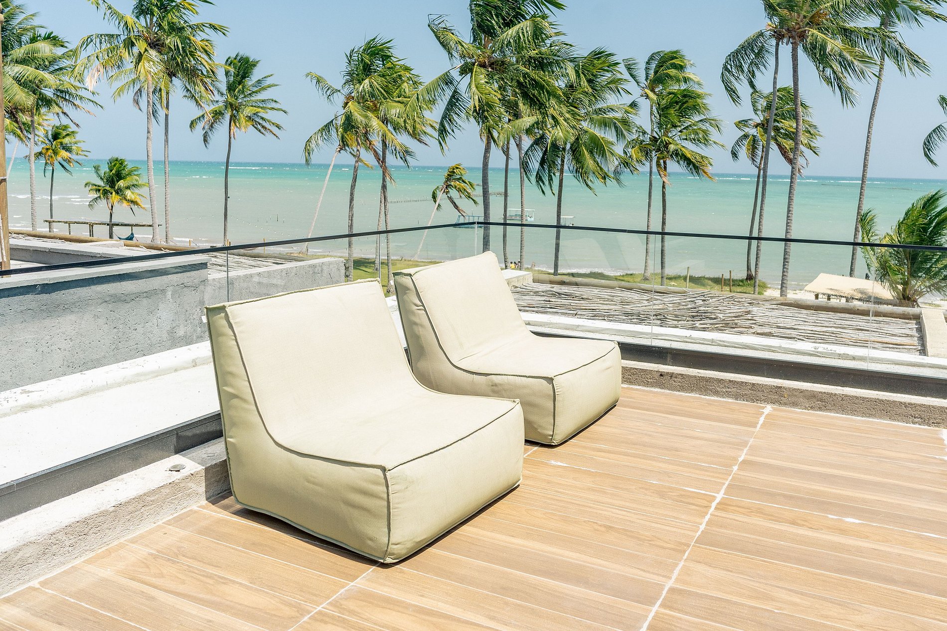 Para aqueles que amam se jogar nos esportes ou curtir uma vista da beira-mar, a hospedagem também oferece uma área comum sem igual que possui quadra de beach tennis e mesas para curtir a paisagem surreal da praia.