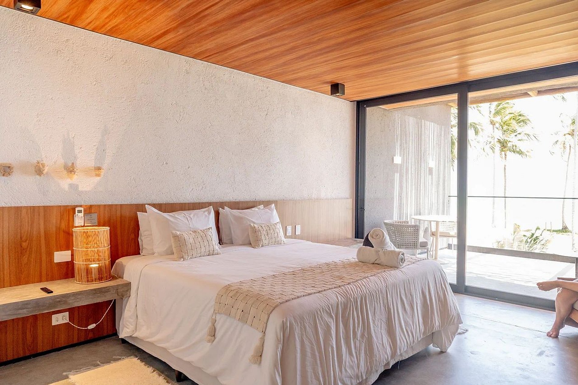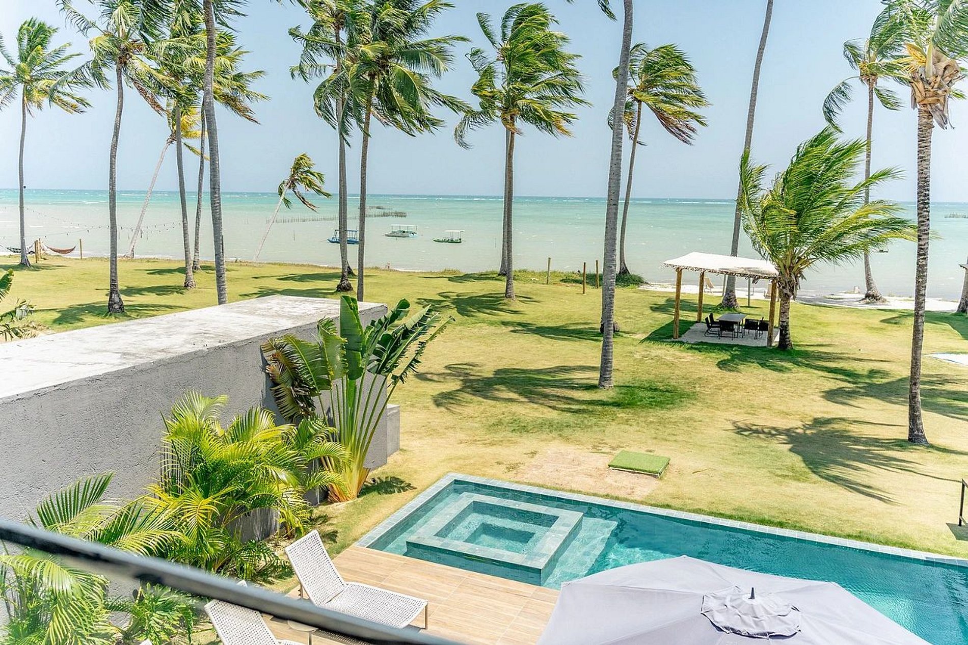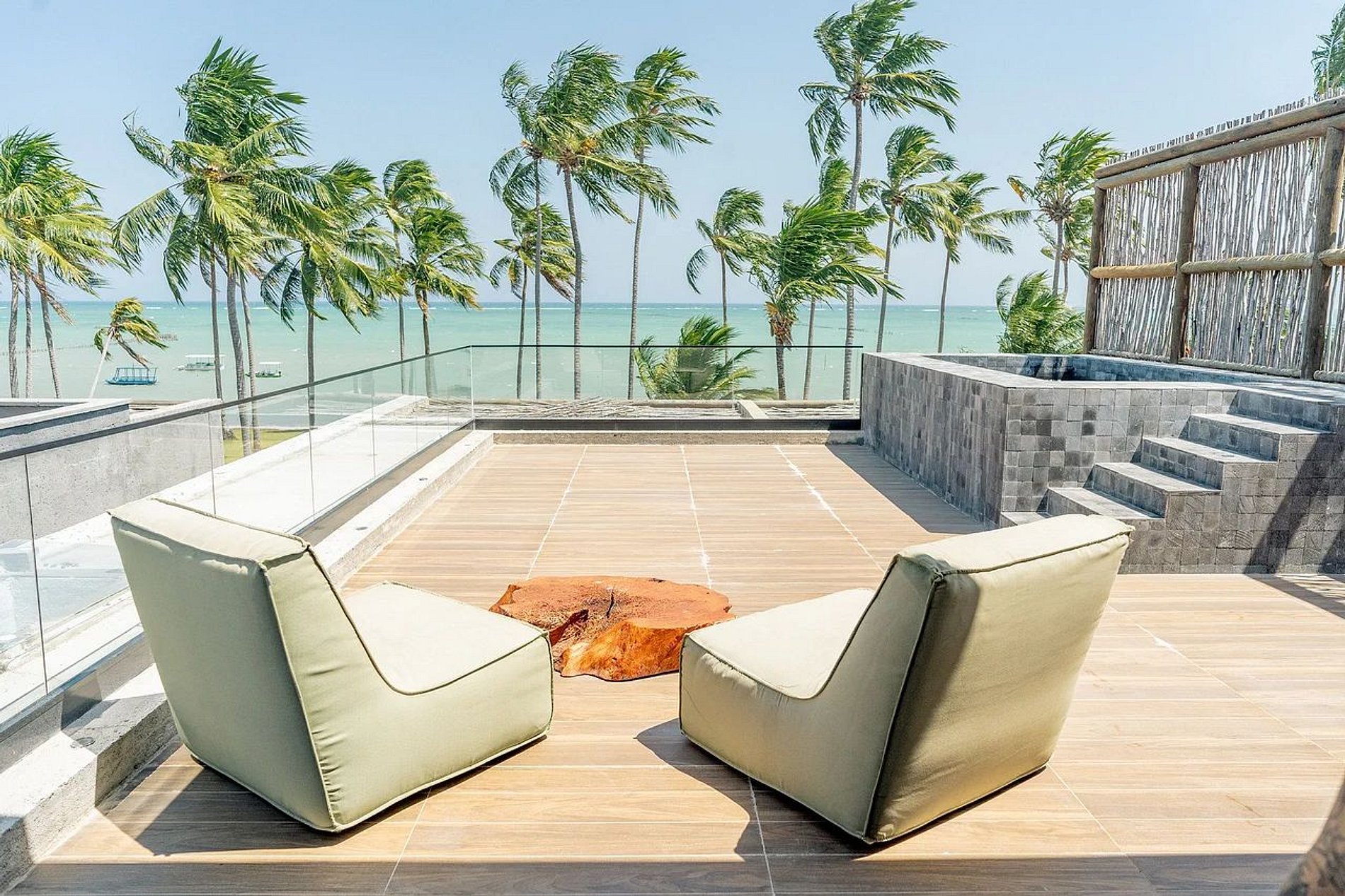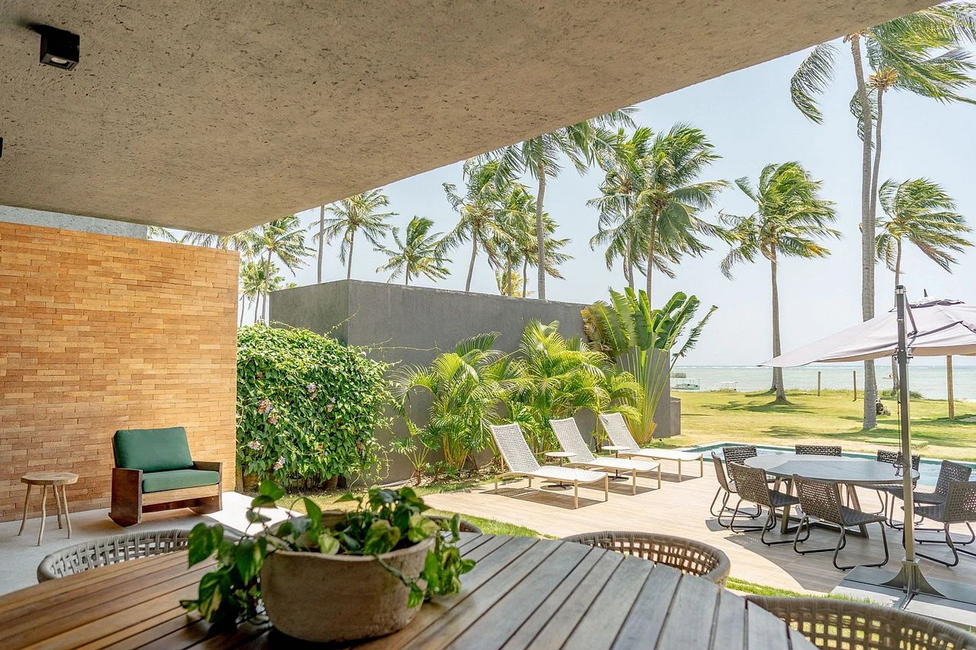 Para aqueles que amam se jogar nos esportes ou curtir uma vista da beira-mar, a hospedagem também oferece uma área comum sem igual que possui quadra de beach tennis e mesas para curtir a paisagem surreal da praia.