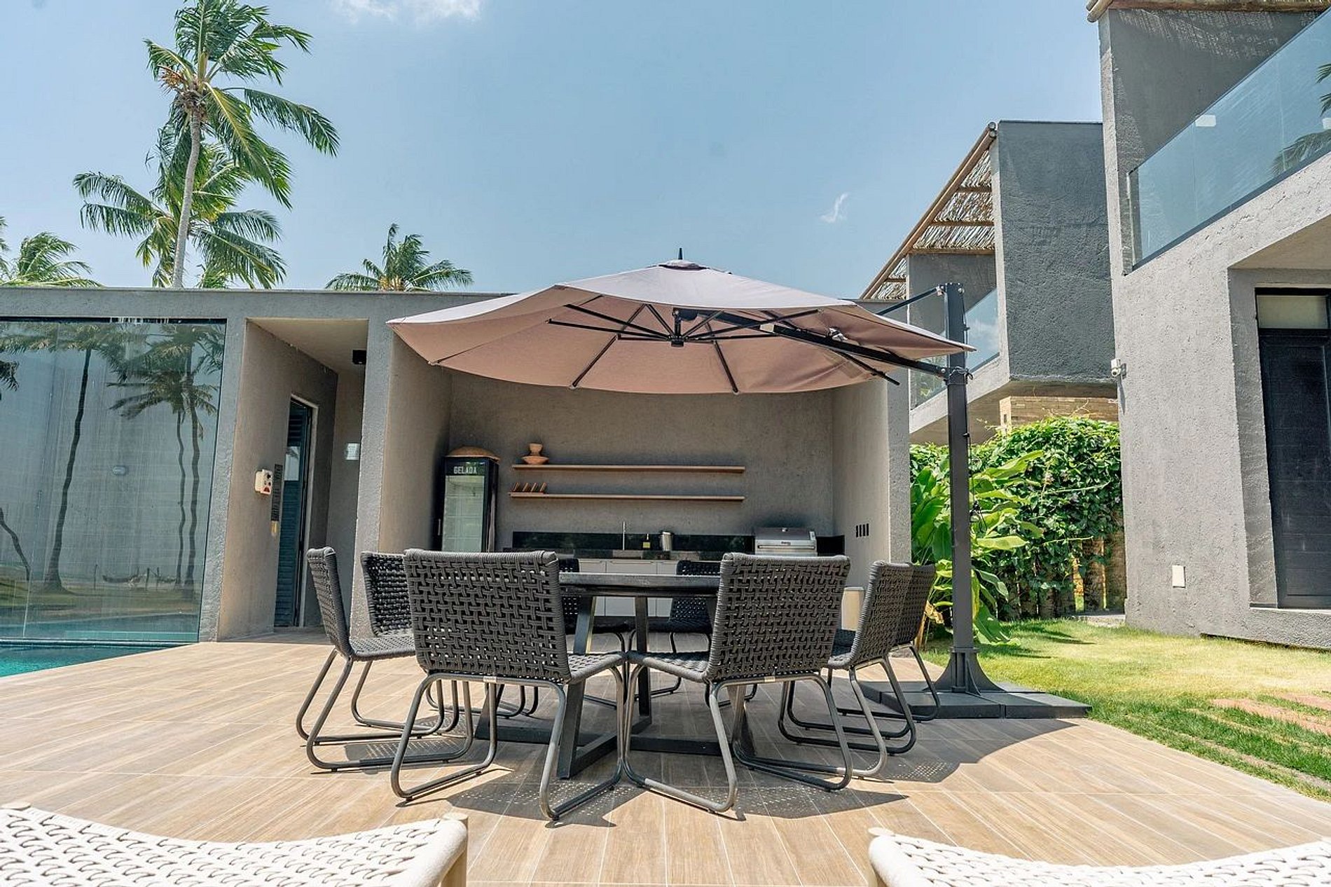 Também não podemos deixar de falar sobre a maravilhosa área gourmet que possui uma mesa circular com 07 cadeiras, ombrelone, freezer, churrasqueira a gás embutida, cooler 60L e louça completa. Já pensou fazer o seu churrasco ou uma noite de vinhos em um lugar como esse?