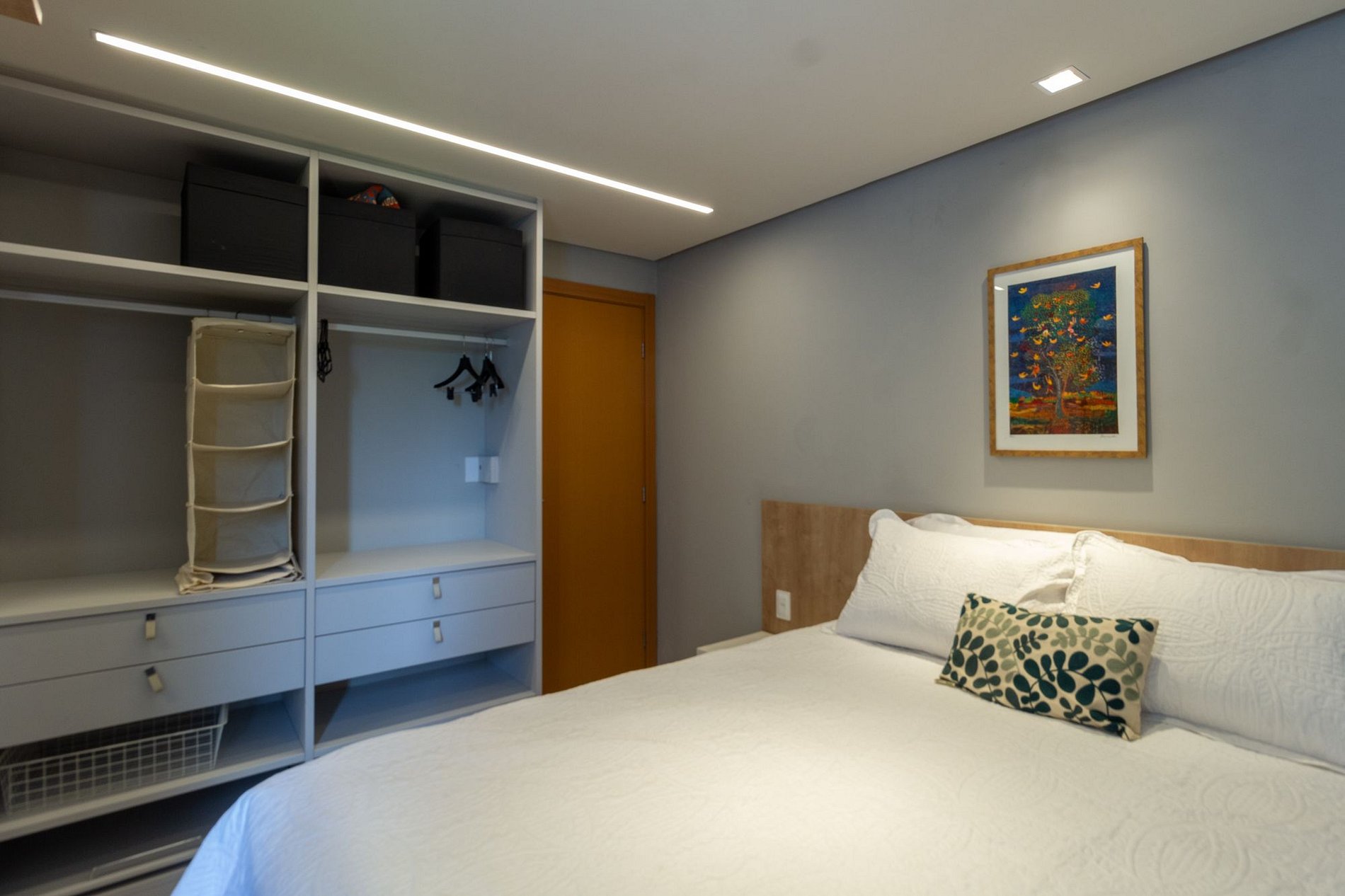 • Suíte 1 (1º andar): cama de casal, ar-condicionado, armário, Smart TV, penteadeira, cortinas blackout, banheiro com chuveiro elétrico e varanda com rede;