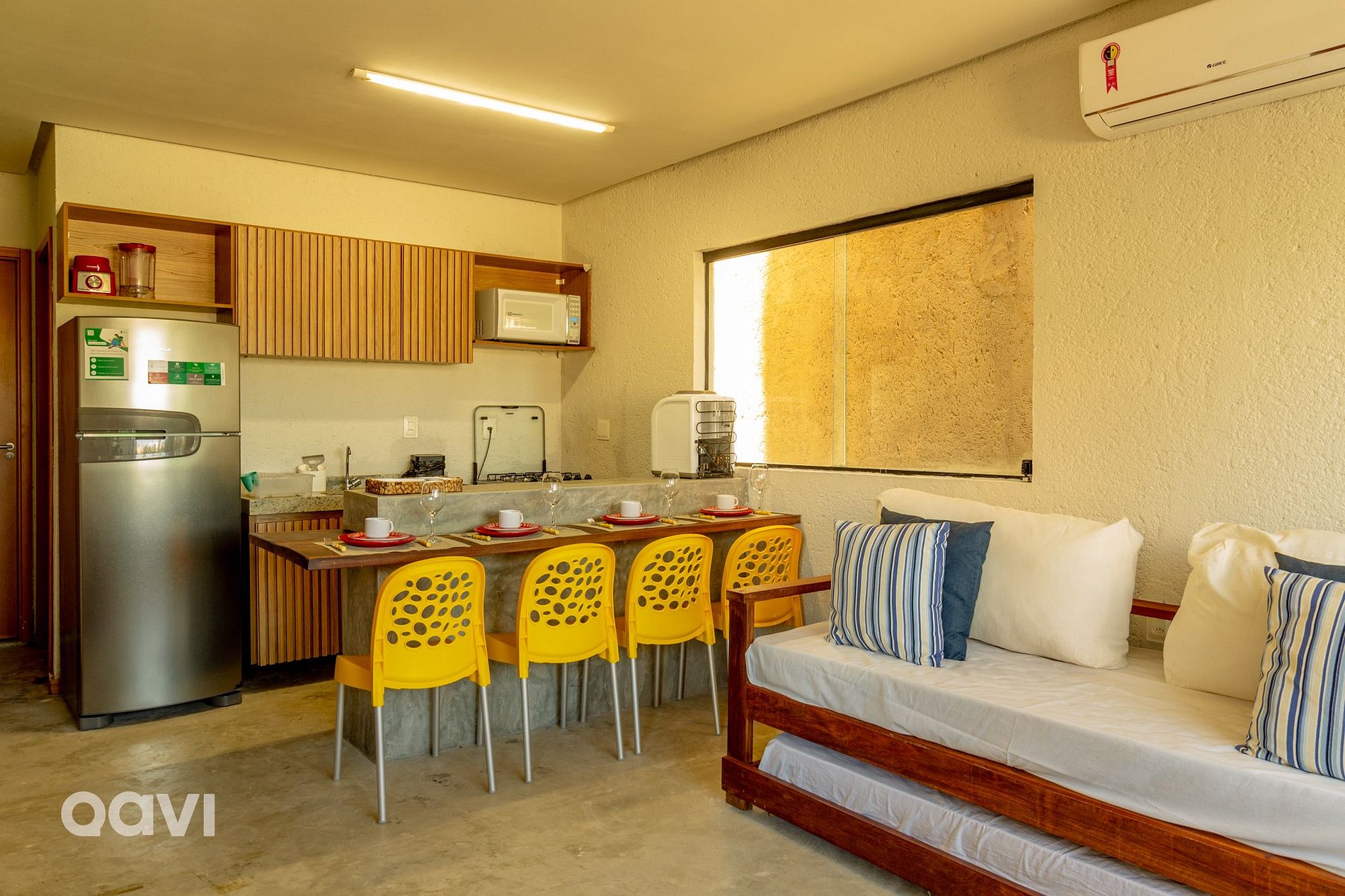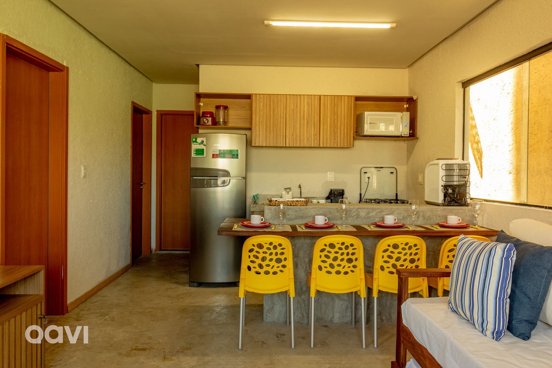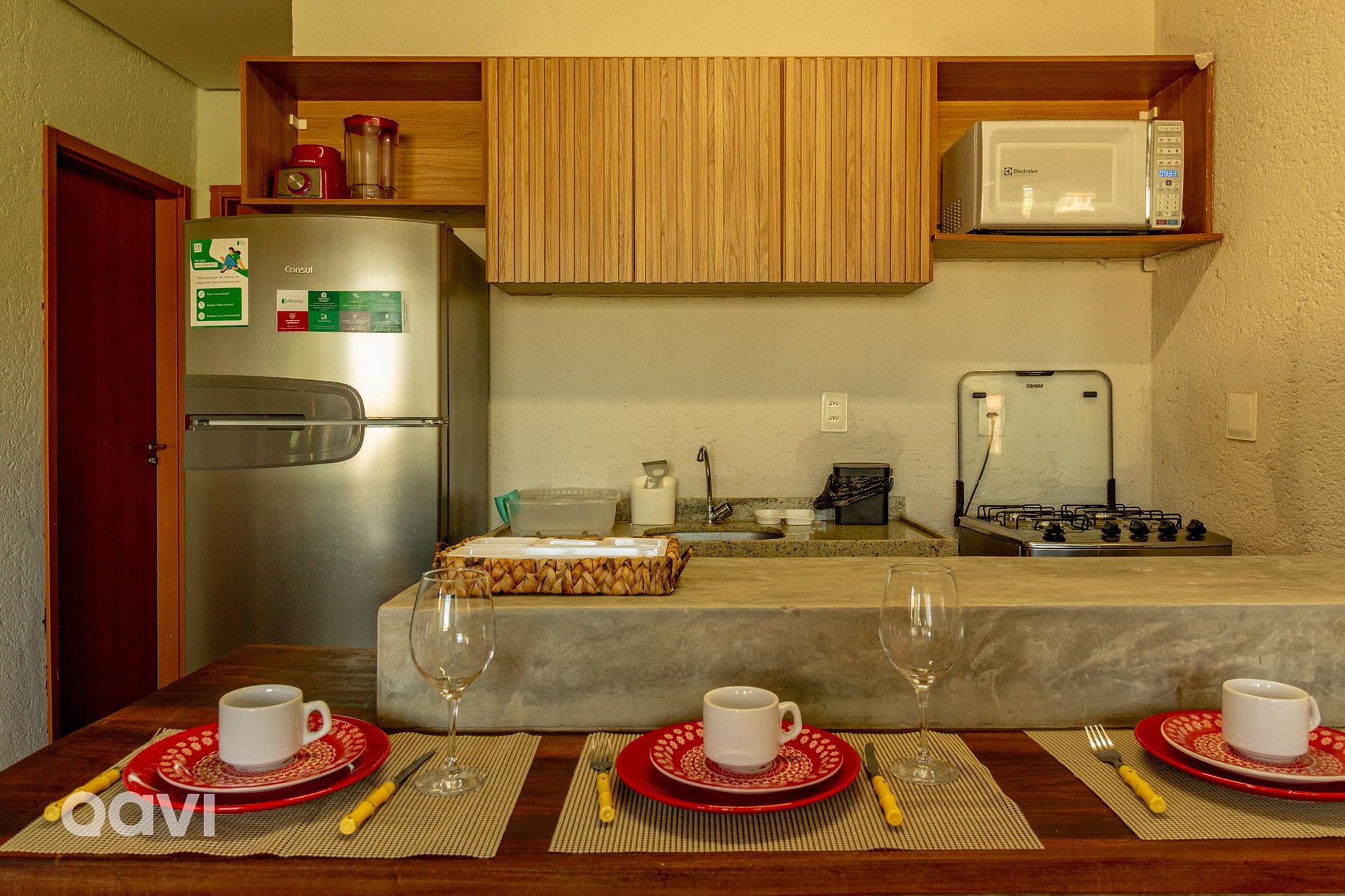 • Cozinha: utensílios completos (talheres, xícaras, panelas, pratos e copos), geladeira, cafeteira, sanduicheira, liquidificador, aparelhos de servir e armários.