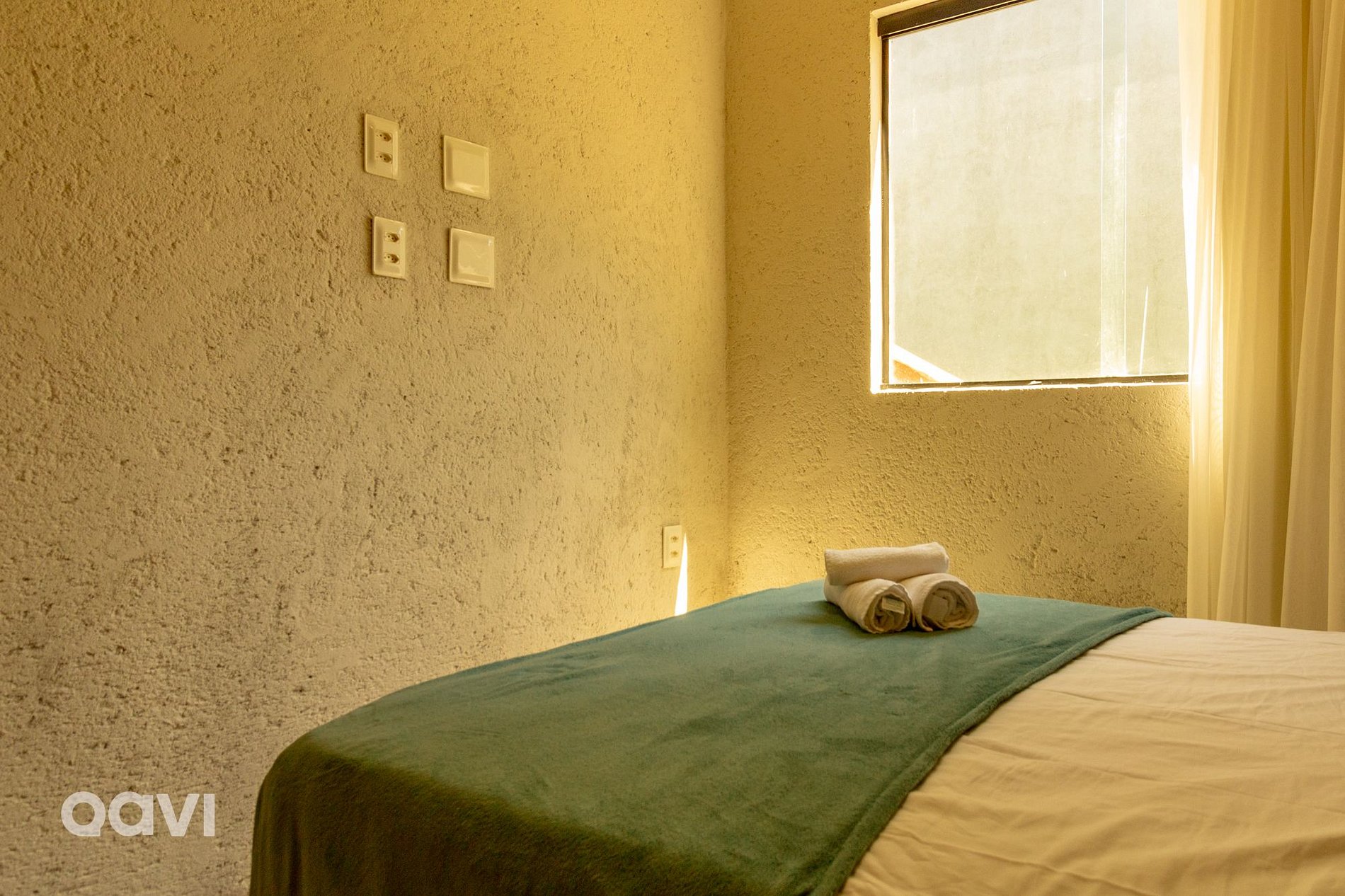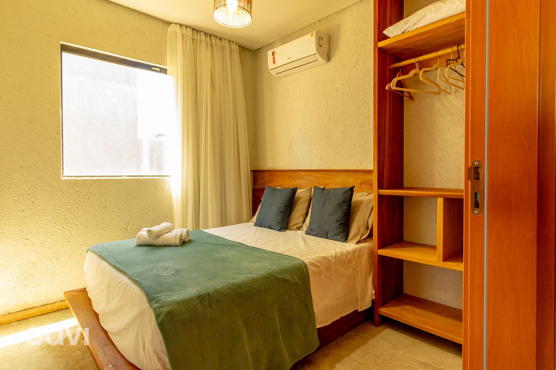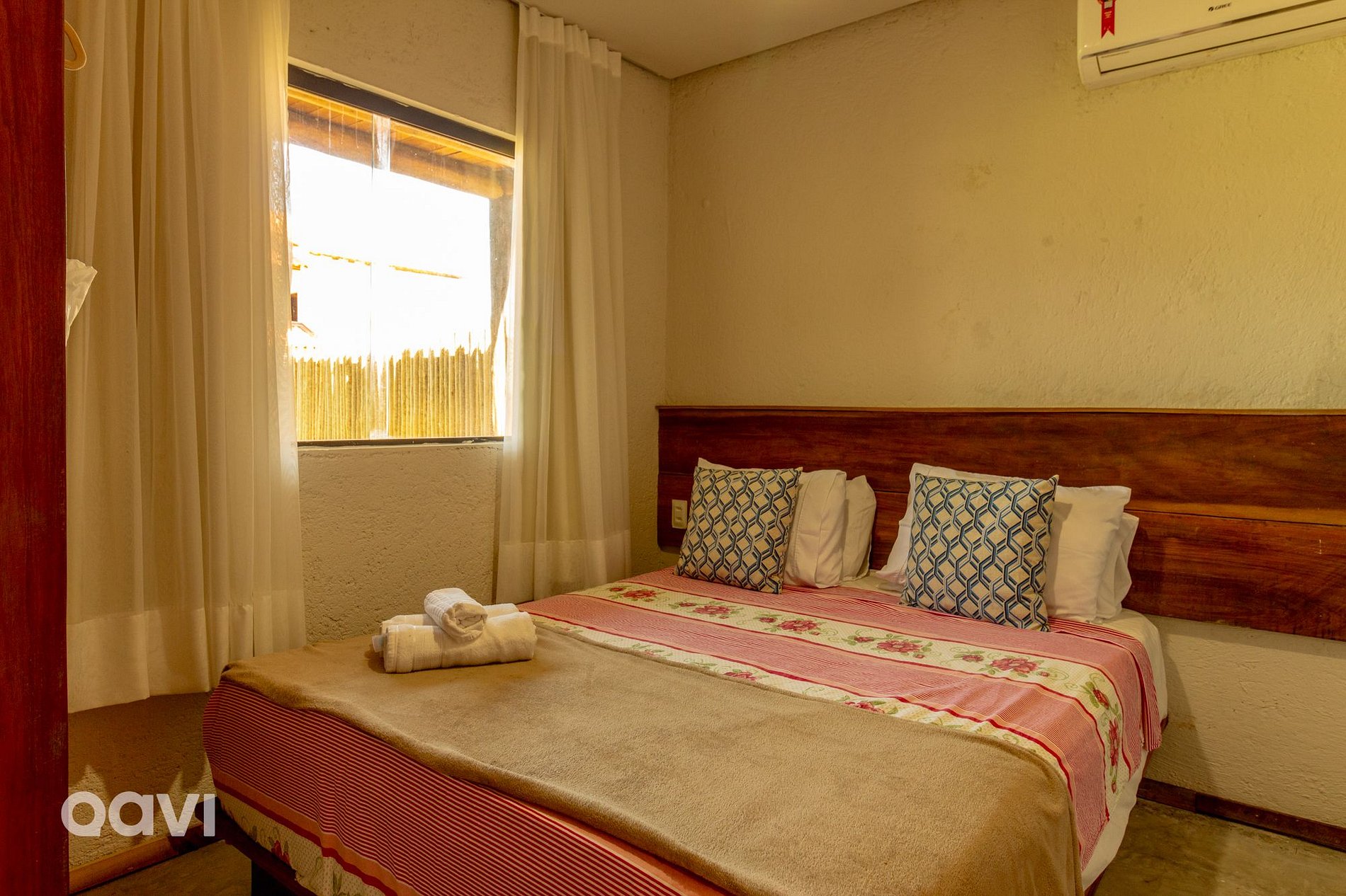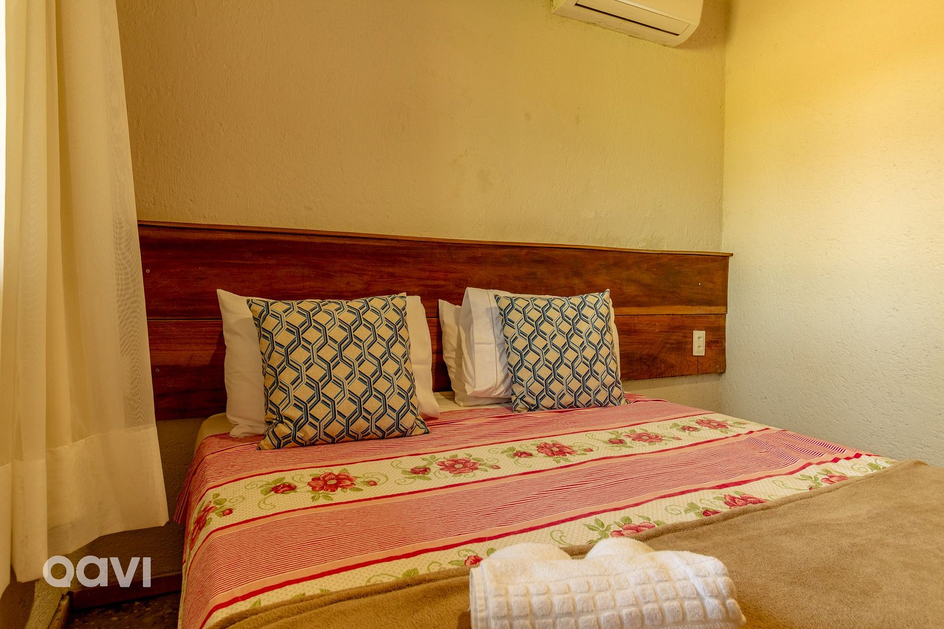 • Suíte 2: cama de casal, ar-condicionado, aparelhos decorativos e banheiro com utensílios básicos;