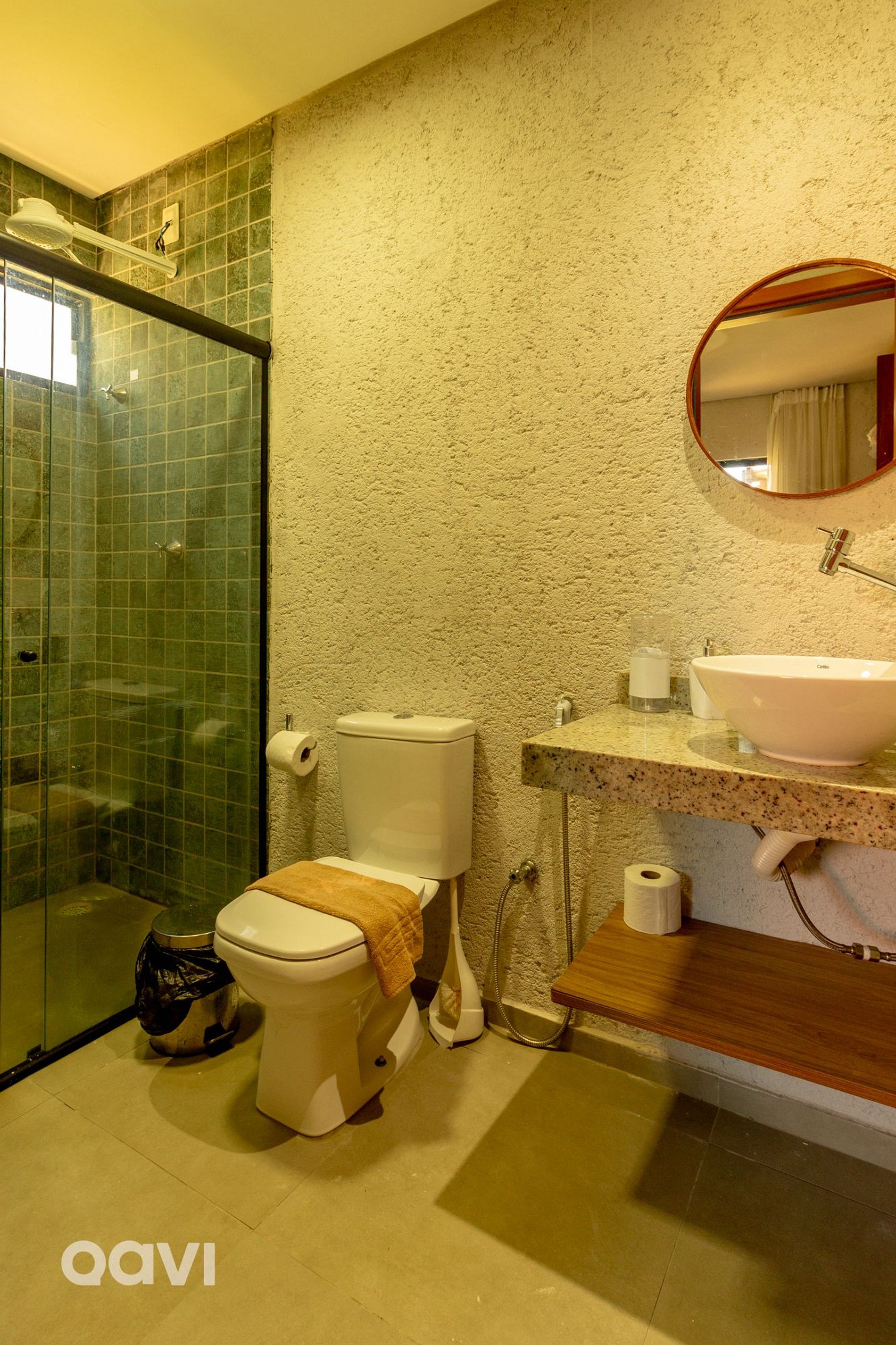 • Suíte 1: cama de casal, ar-condicionado, aparelhos decorativos e banheiro com utensílios básicos;