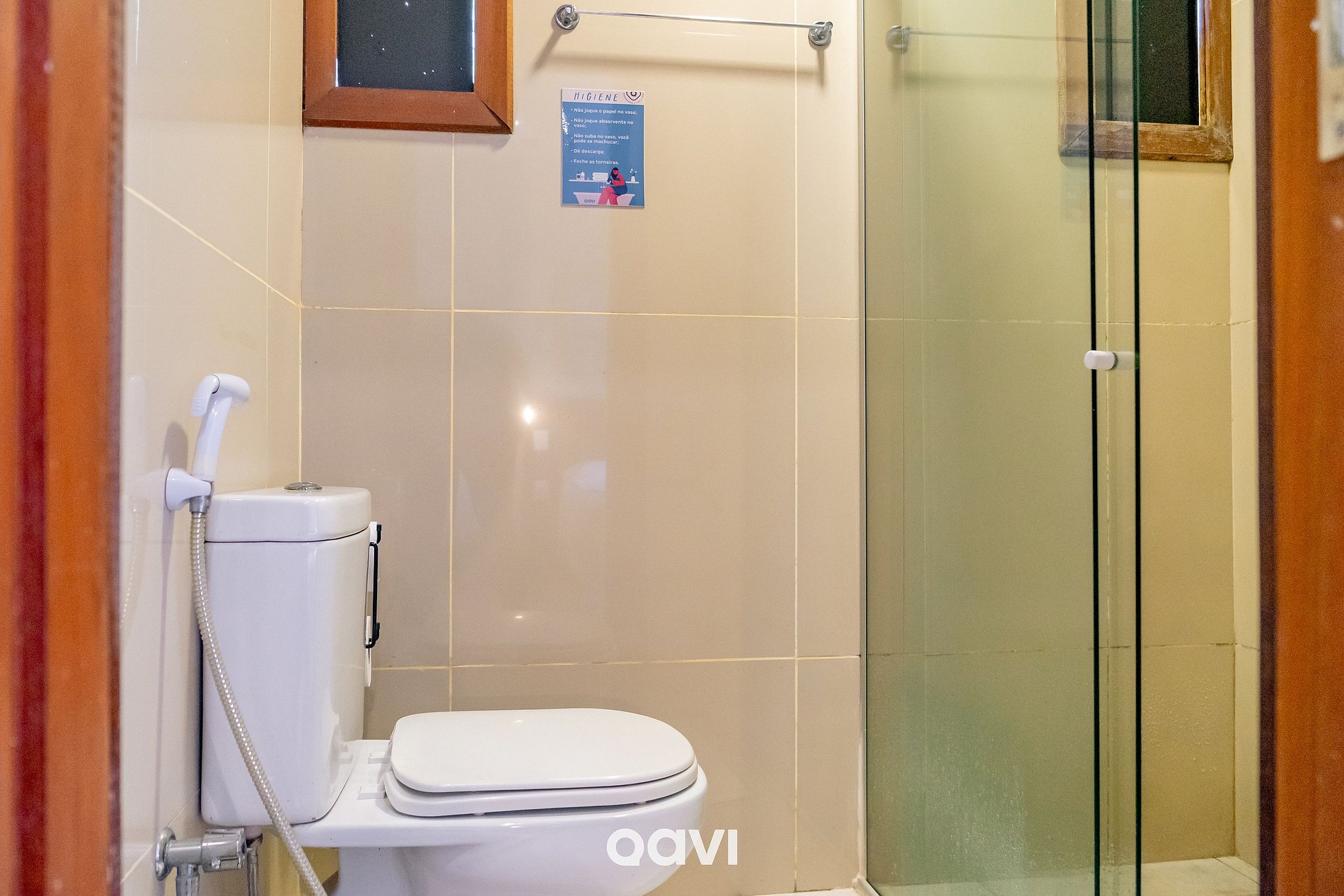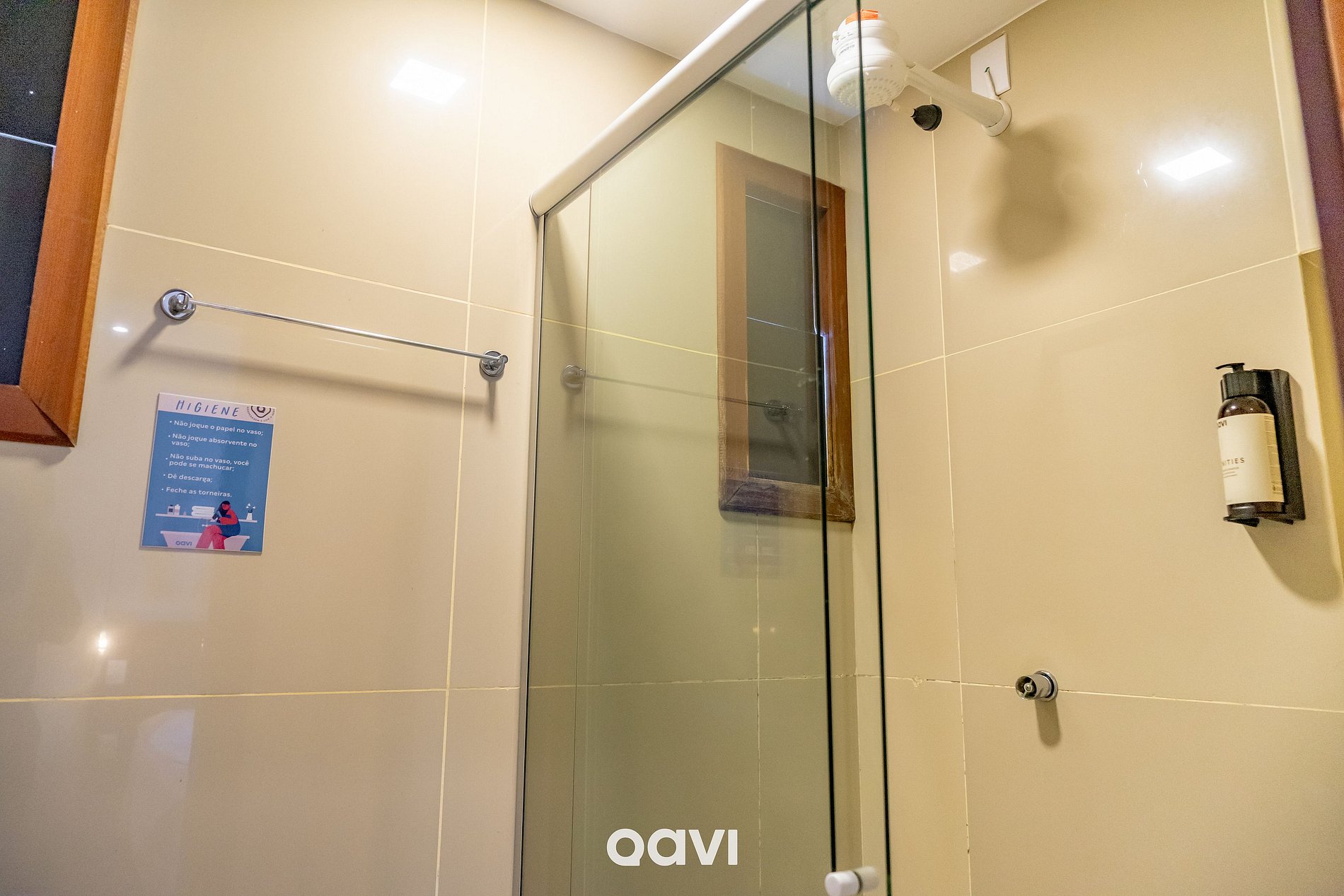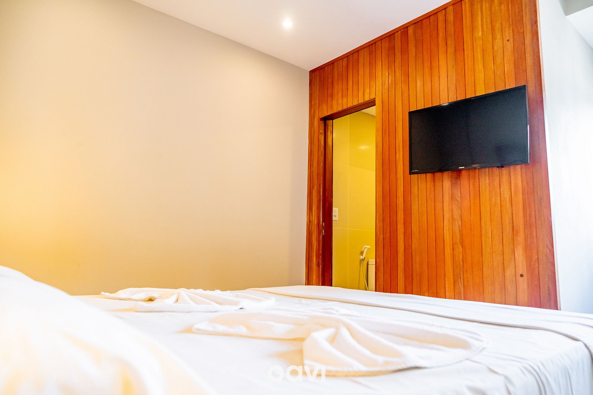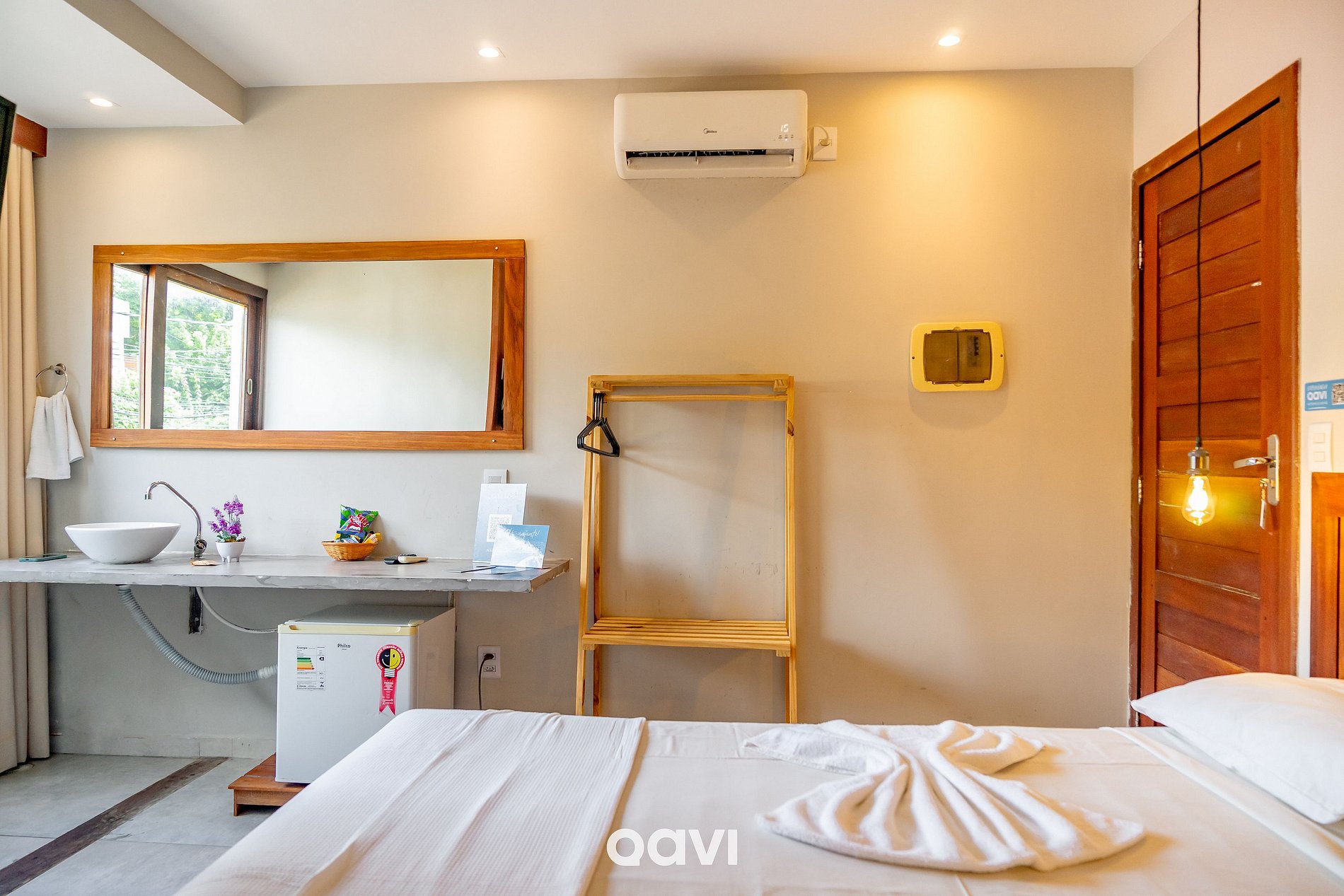A suíte se distribui em quarto com uma cama de casal, uma cama de solteiro com bicama, ar condicionado, frigobar e televisão e banheiro com chuveiro elétrico.