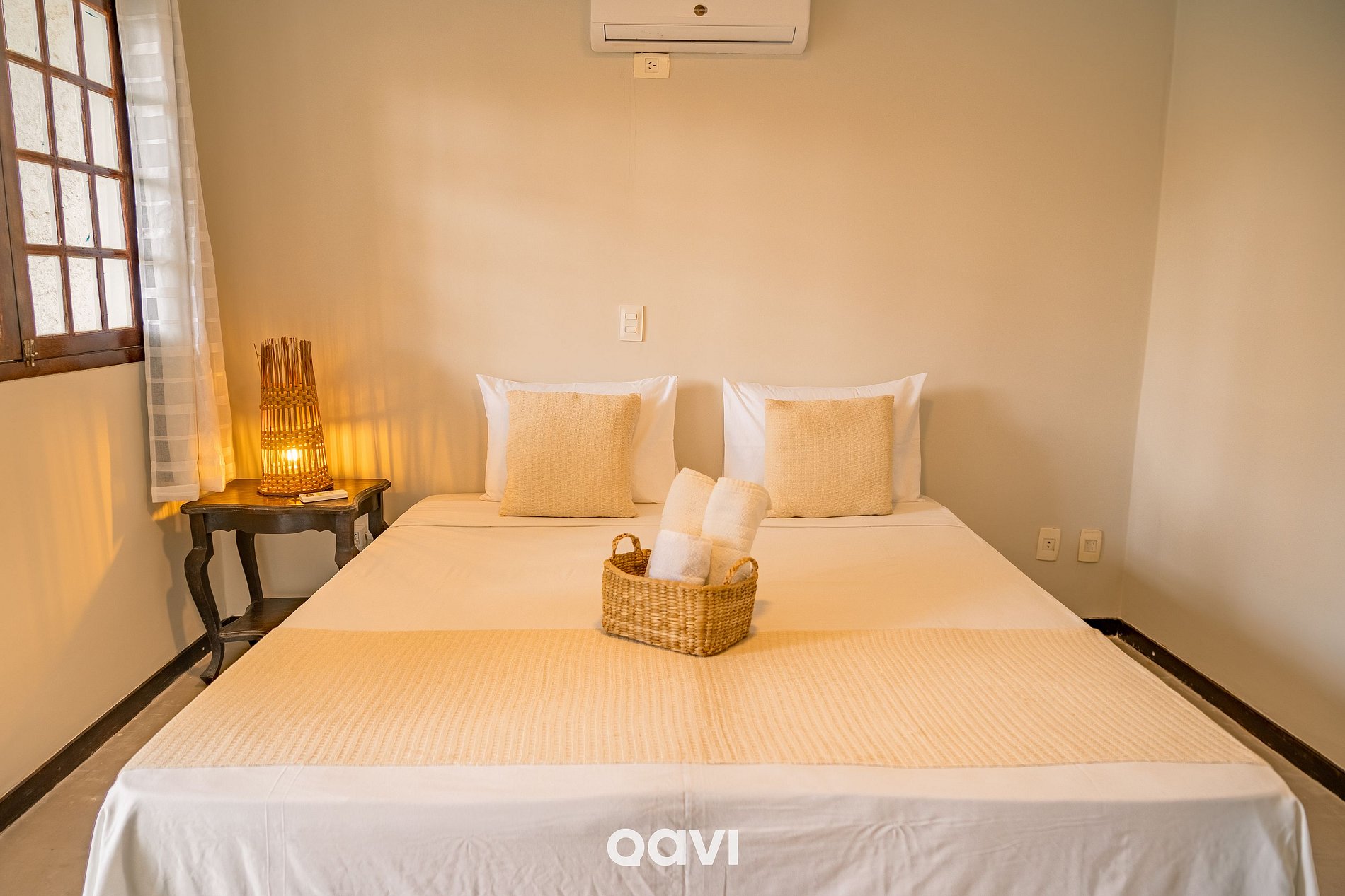- Quarto: 01 cama de casal, ar-condicionado, armário e banheiro privativo.