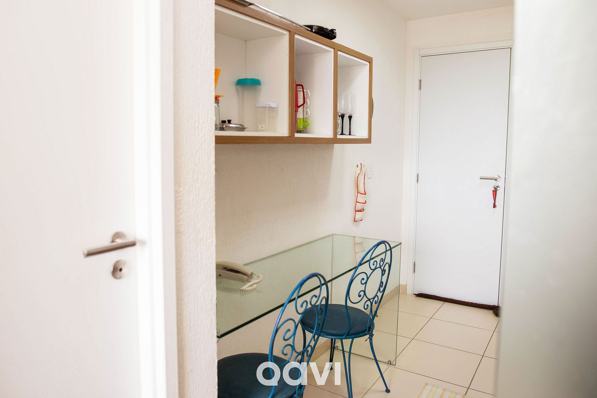 - Cozinha mobiliada com bancada em granito, cooktop, depurador de ar, geladeira, micro-ondas, liquidificador, grill, máquina de café oster e cutelaria em geral, todos recém adquiridos. Sala de jantar/estar com TV de 32", sofá cama de casal e varanda com rede.