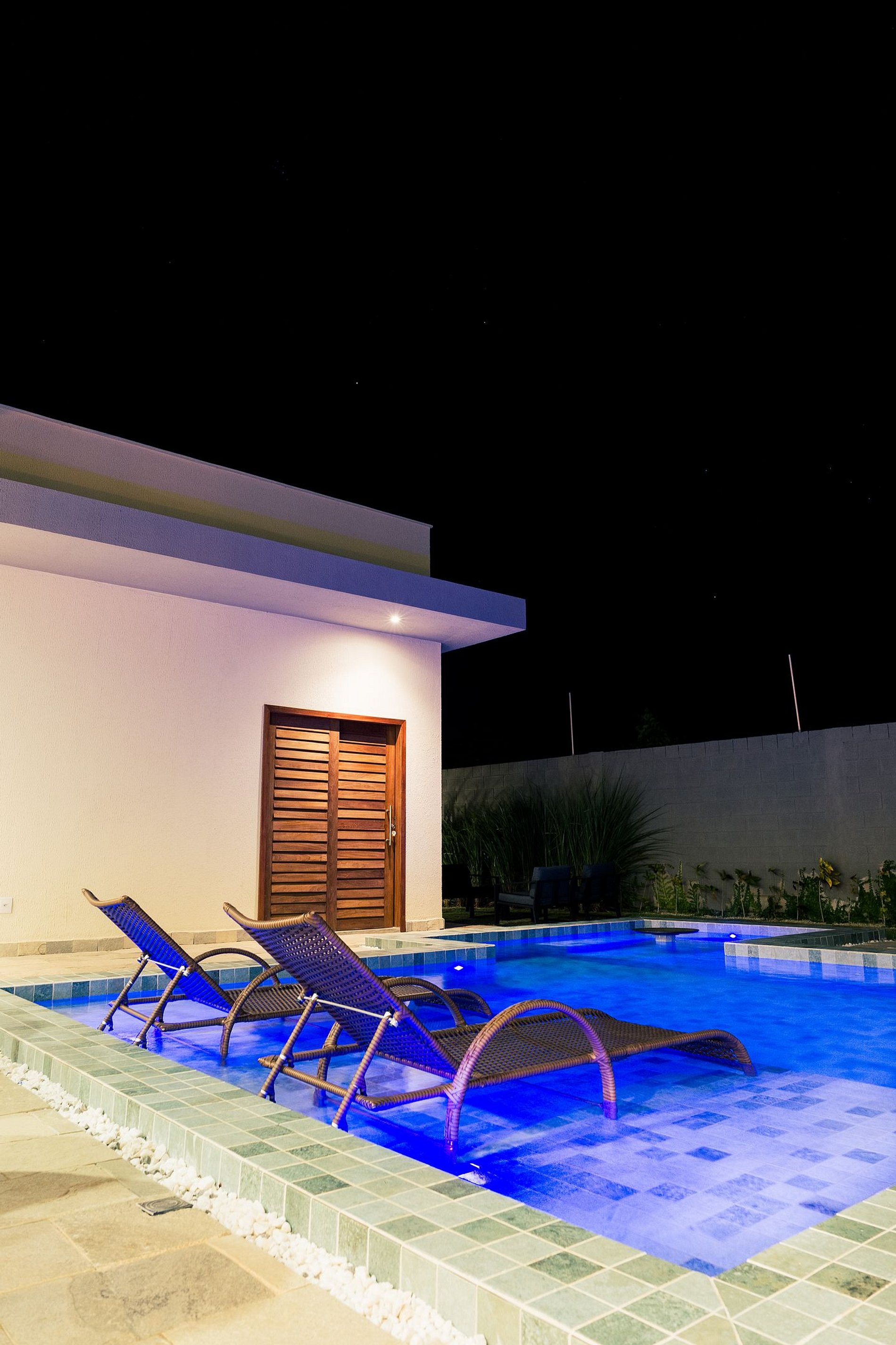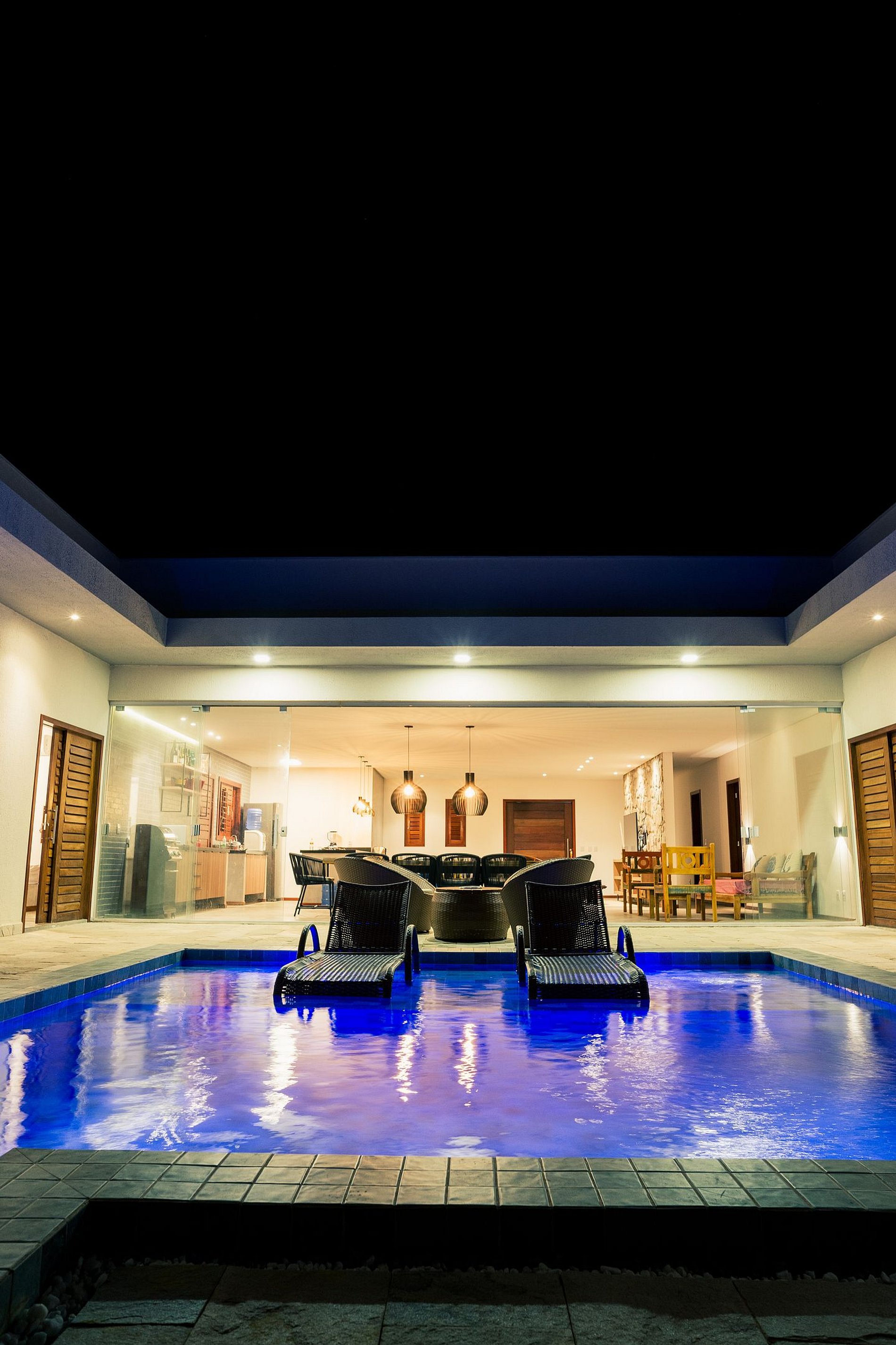 Na casa, o destaque é a piscina integrada à sala e cozinha, separada apenas por uma elegante cortina de vidro retrátil. Além de um ambiente amplo e moderno, com sofá, Smart TV, mesa de jantar em madeira maciça, mesa redonda com cadeiras, e bancada americana.