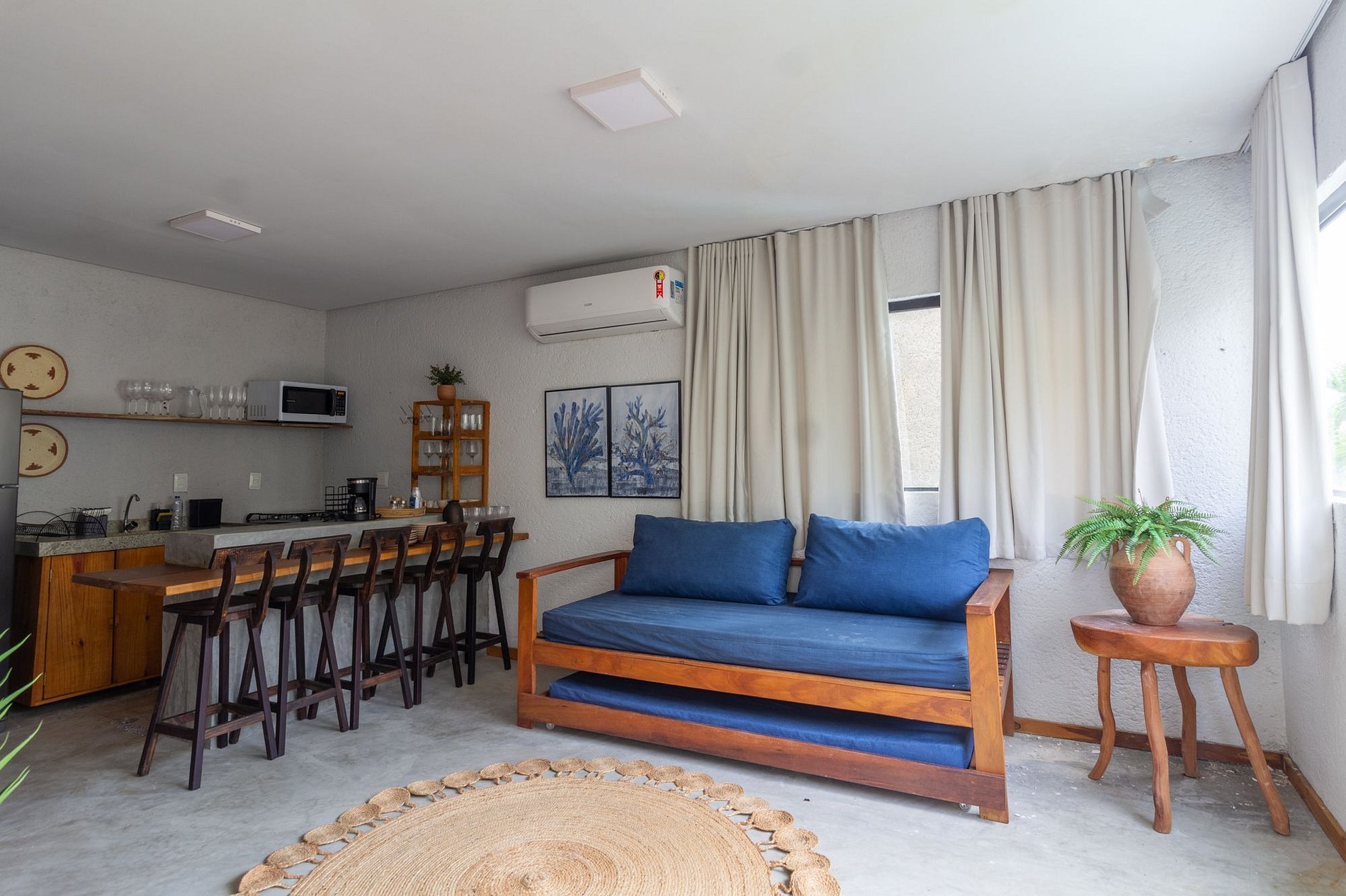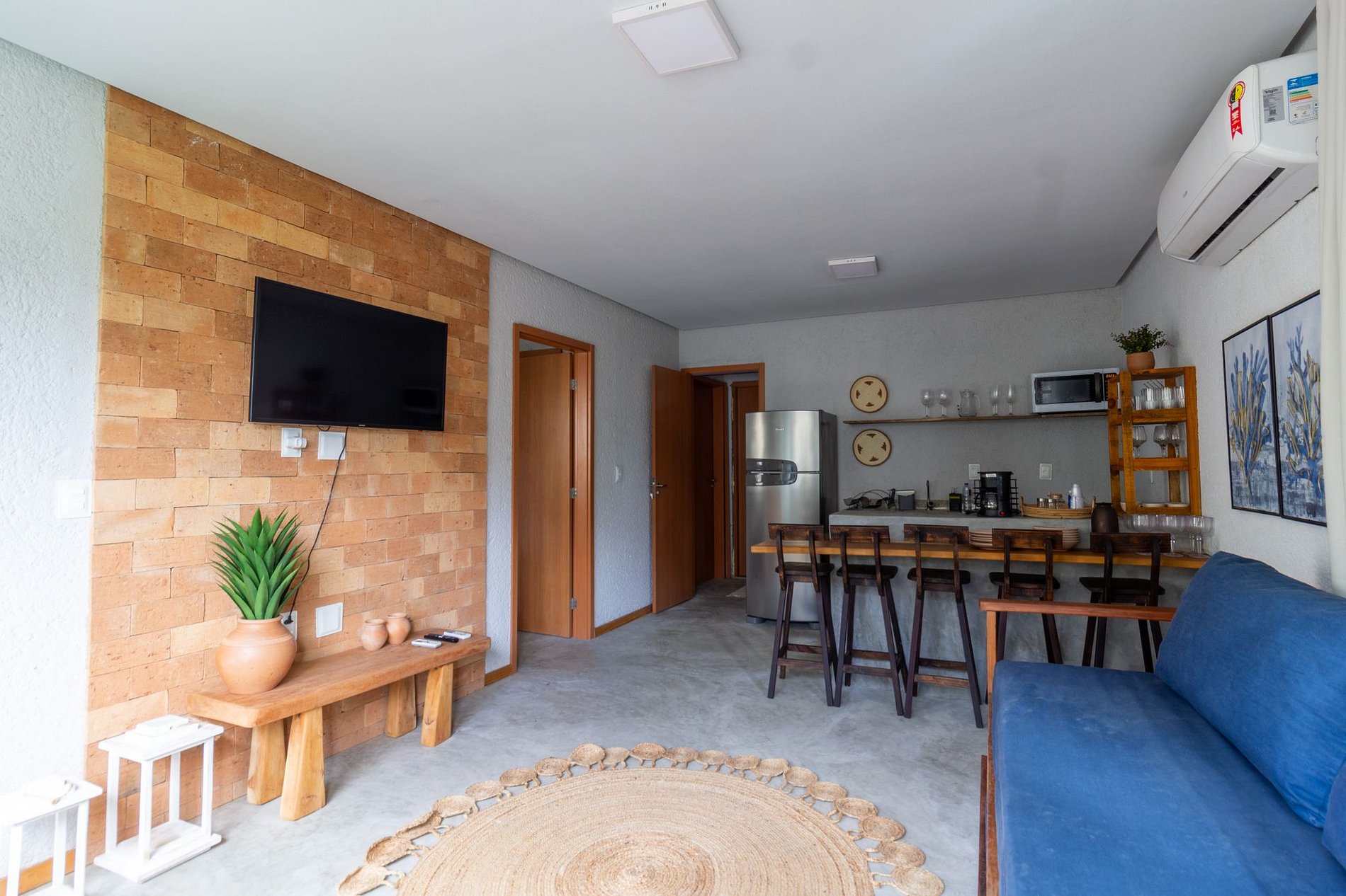 • Suíte 1: cama de casal, ar-condicionado, aparelhos decorativos e banheiro com utensílios básicos;