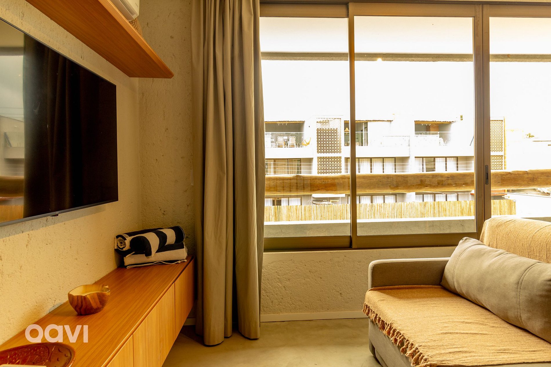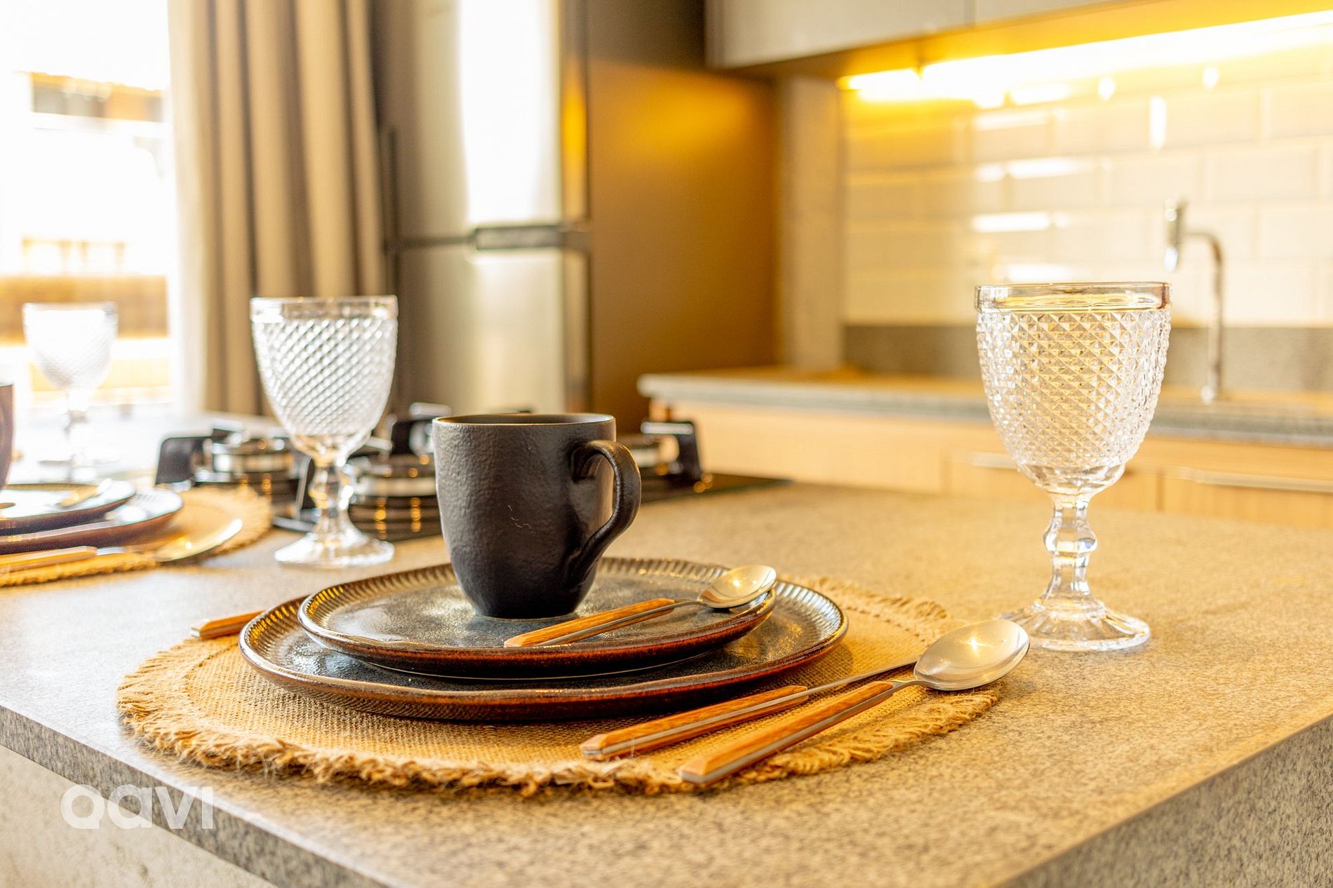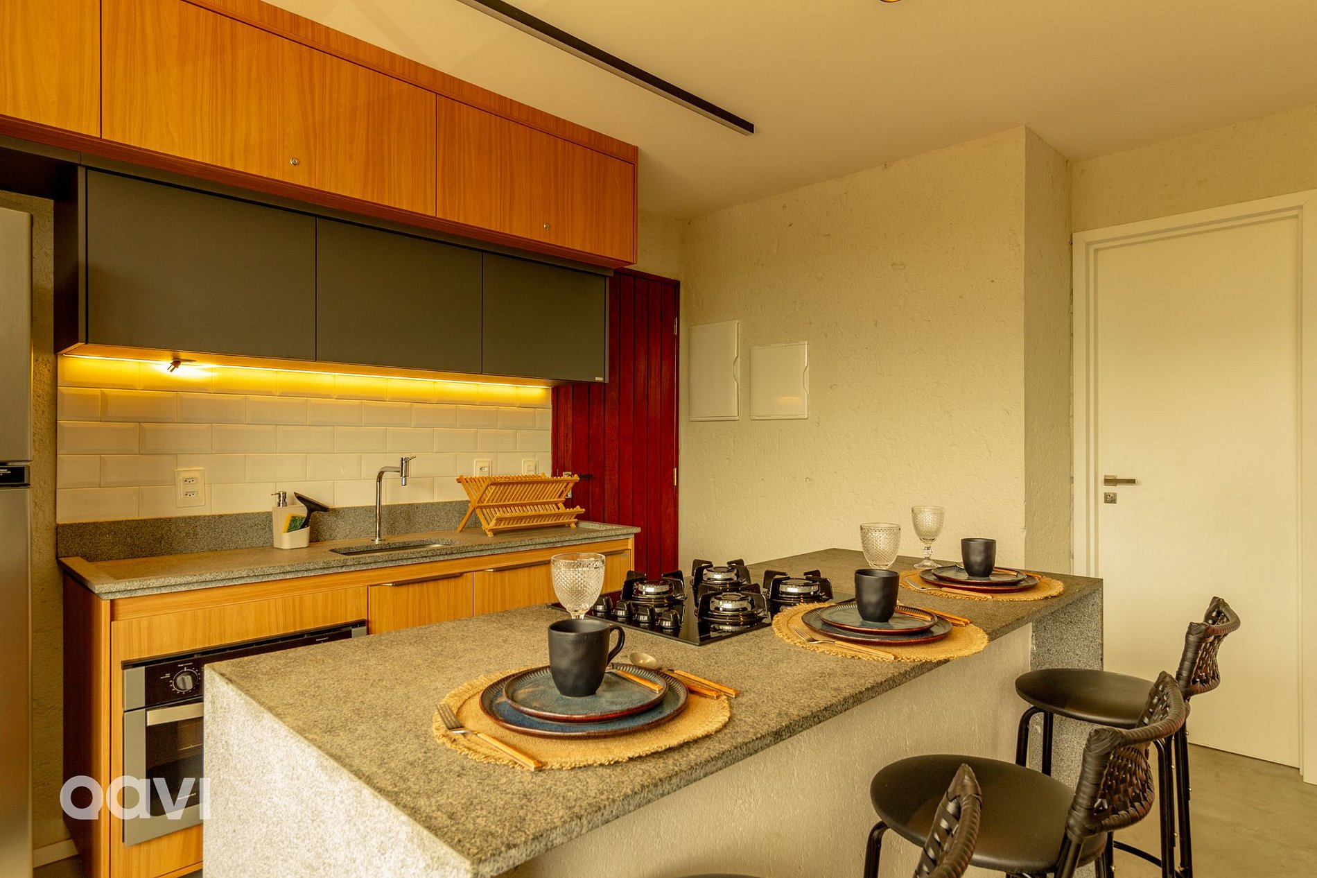 • Sala: Espaço amplo com ambiente integrado, sofá-cama e televisão Smart, ilha para refeições e integração com a cozinha;