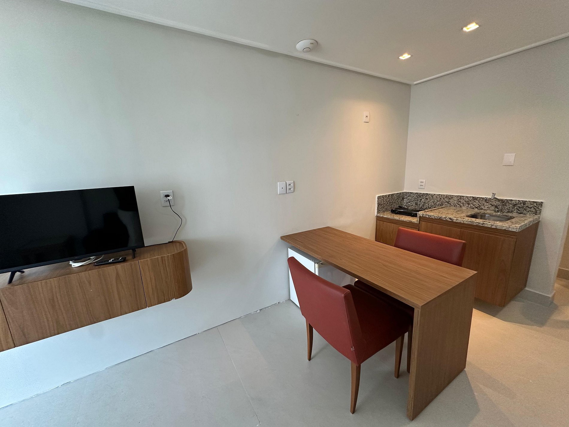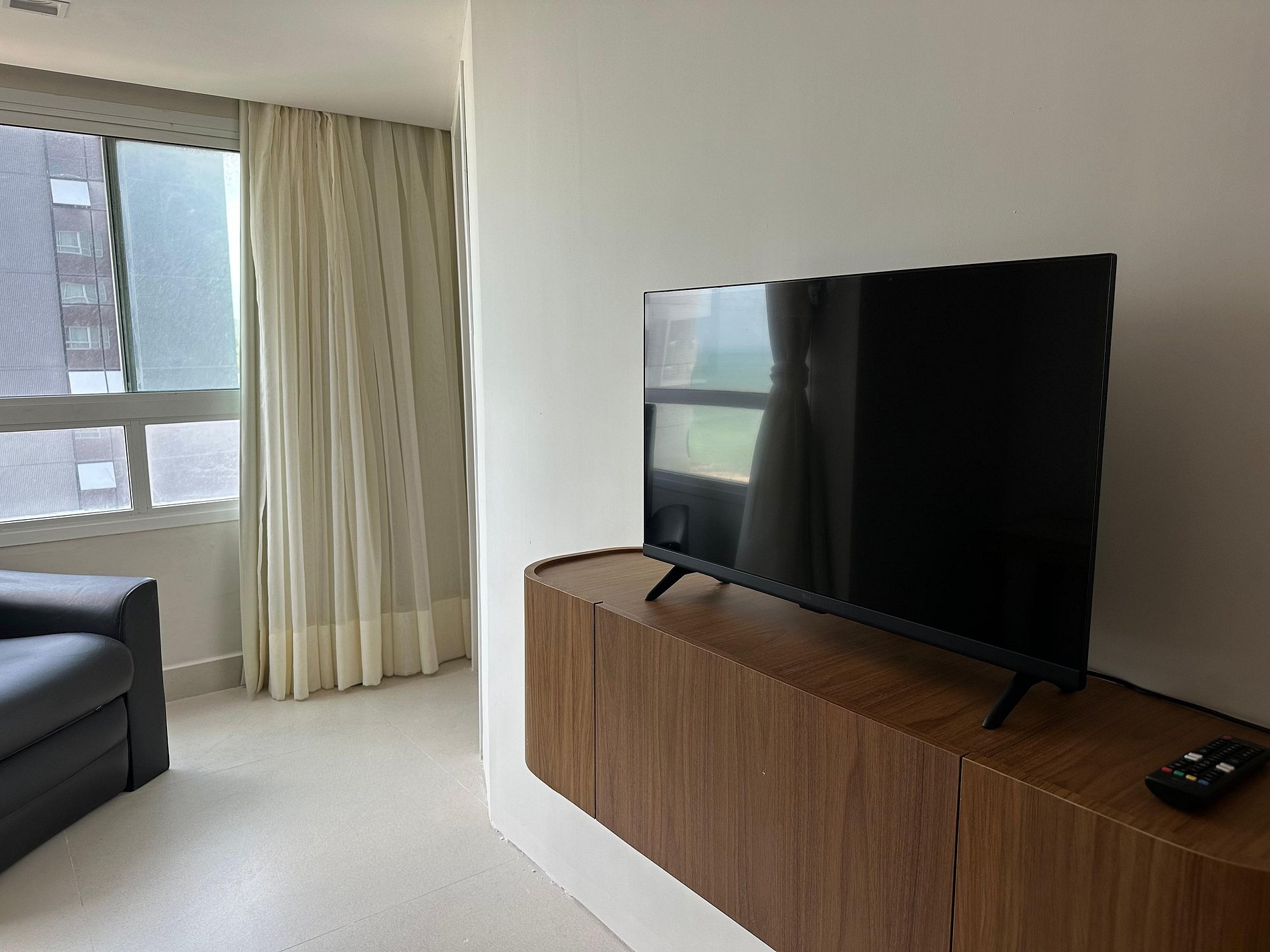 O quarto, com vista lateral para o mar, possui: cama de casal, sofá cama, frigobar, poltrona relaxante, cozinha compacta com mesa de apoio, 2 cadeiras, Wi-Fi, mesas de cabeceira, armário e cabides, ar-condicionado, banheiro com chuveiro quente e secador, Smart TV e interfone.