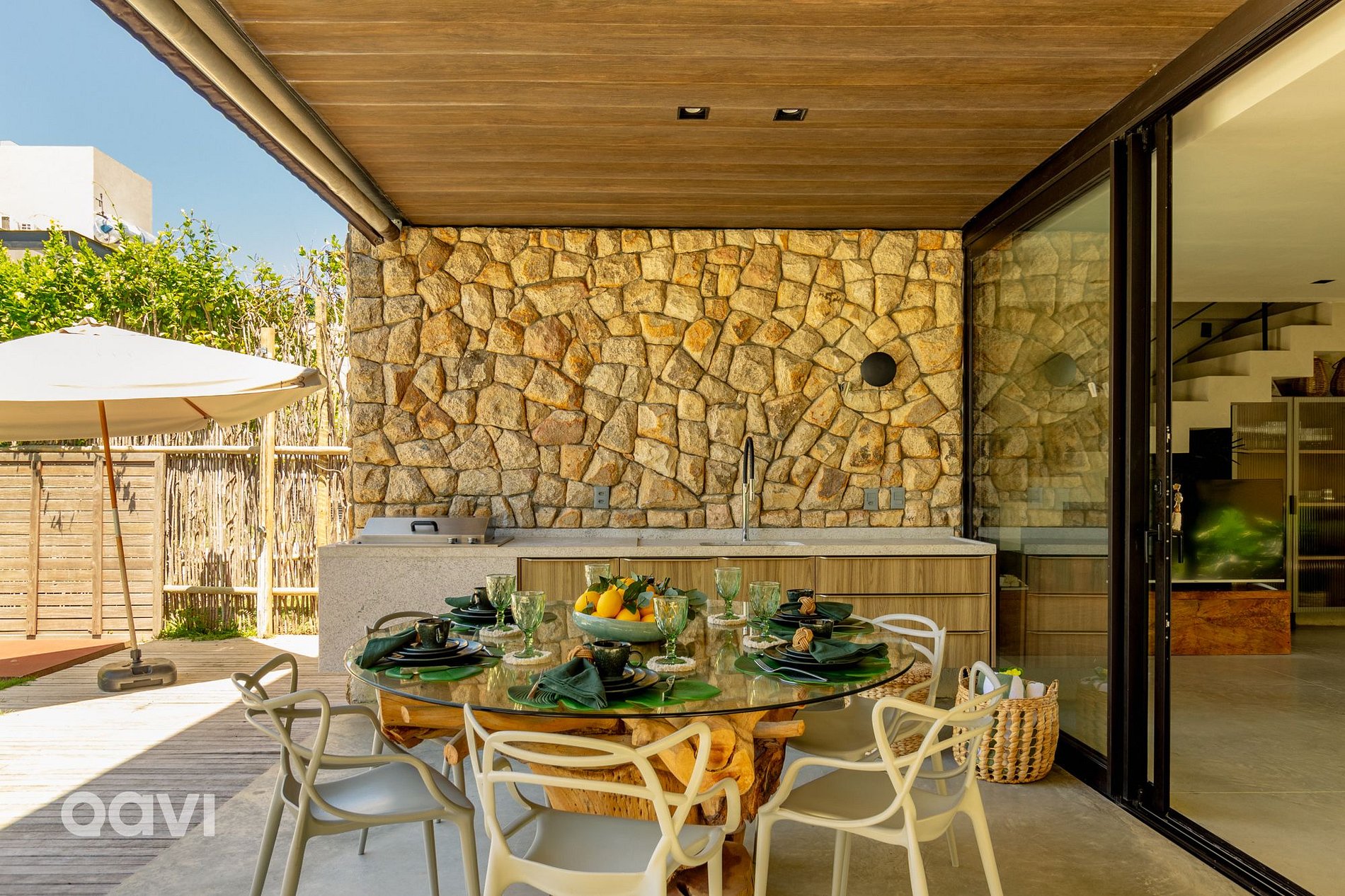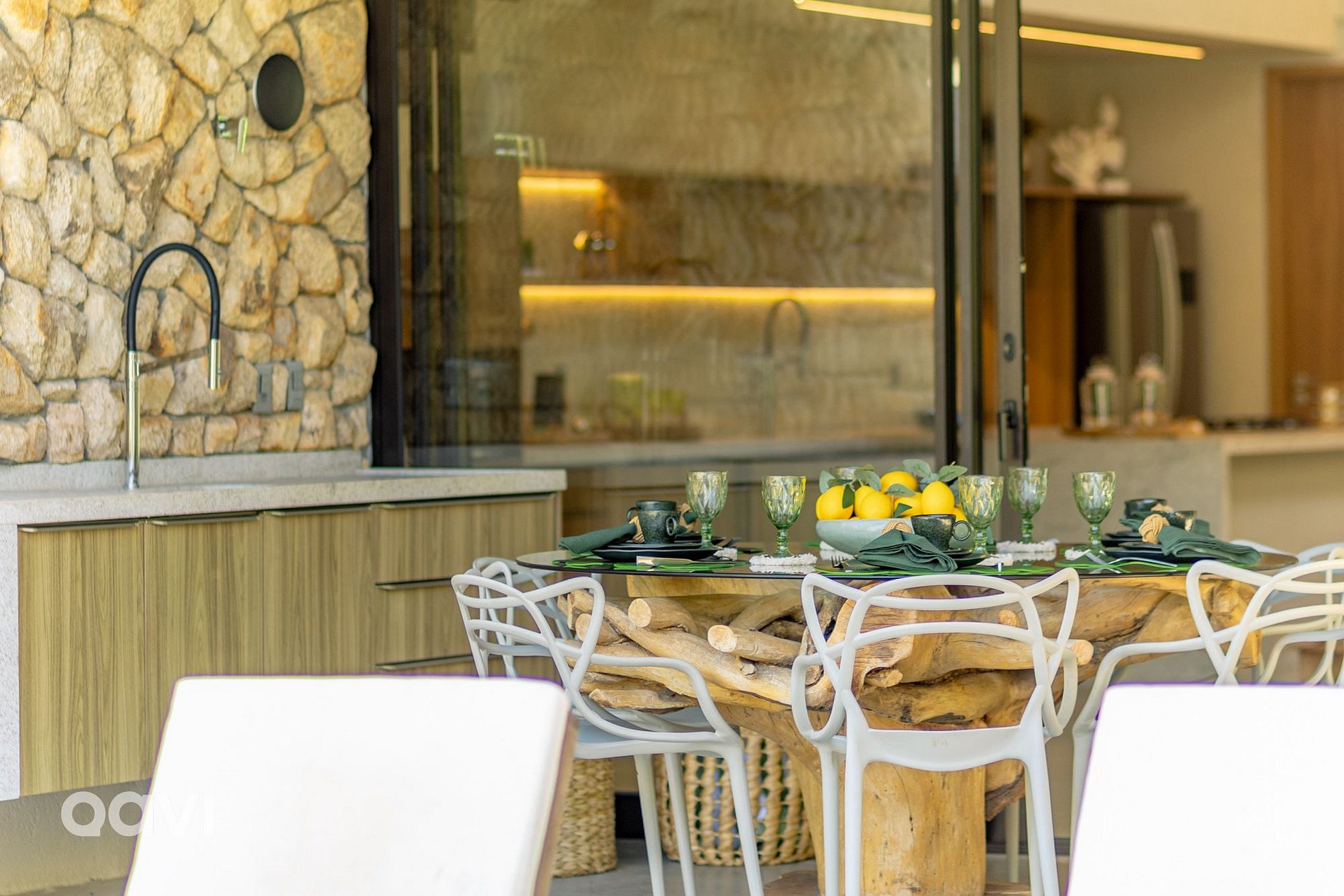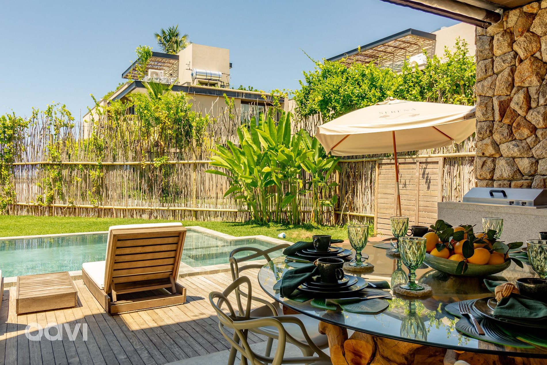 • Área da varanda térrea externa: Piscina, churrasqueira, cervejeira e mesa para refeições;
