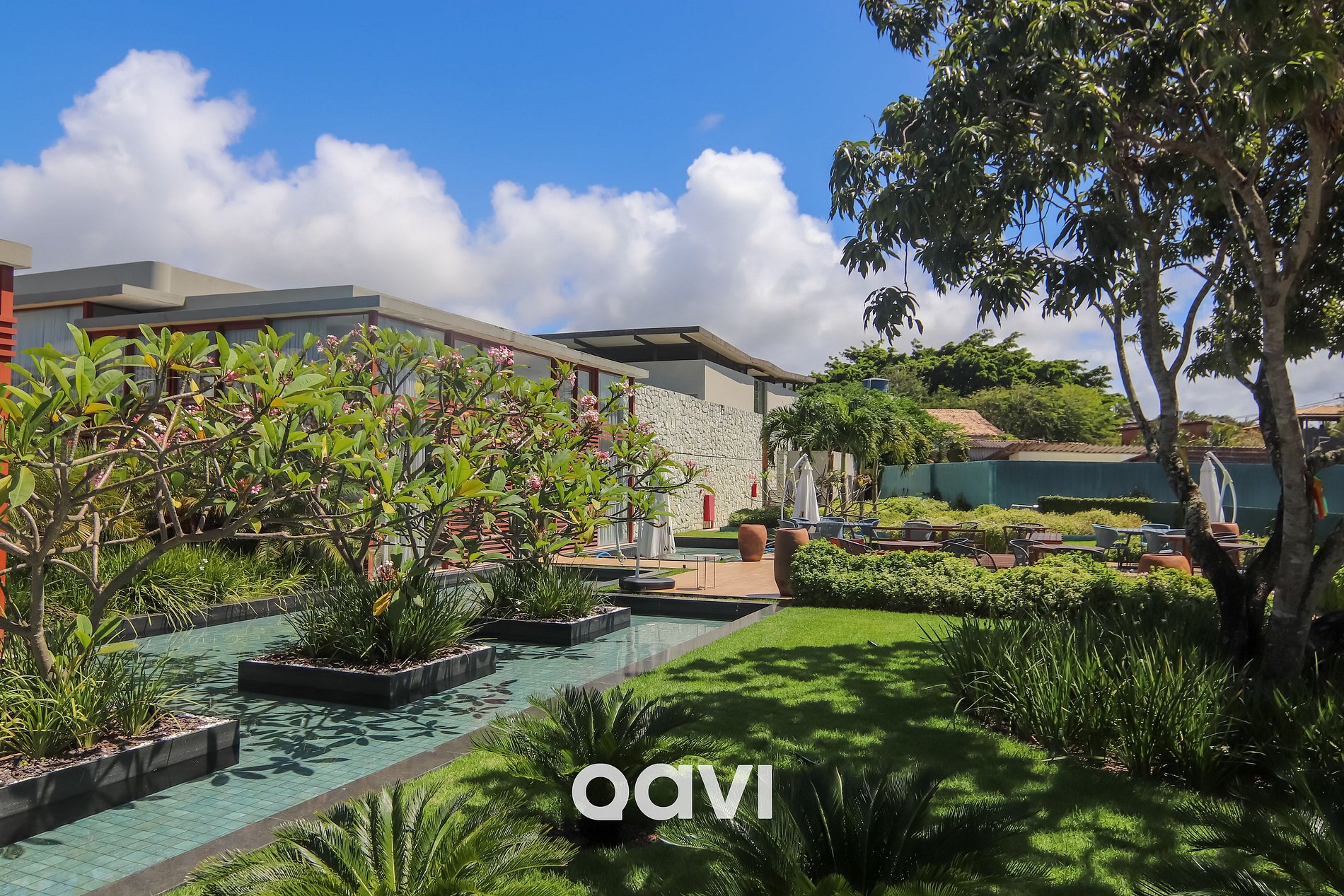 O condomínio possui um belo jardim e uma piscina adulta central, além disso, possui uma praia artificial com espreguiçadeiras.