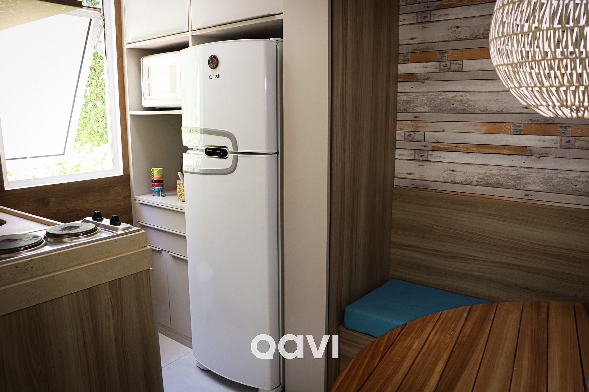 • Cozinha compacta e equipada (fogão elétrico, geladeira, micro-ondas + utensílios básicos)
