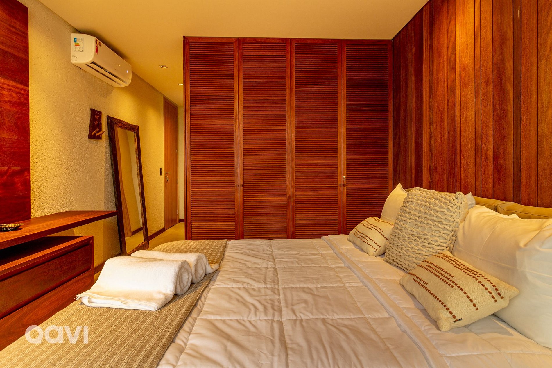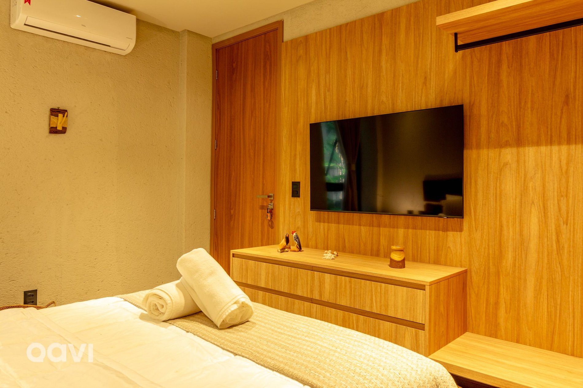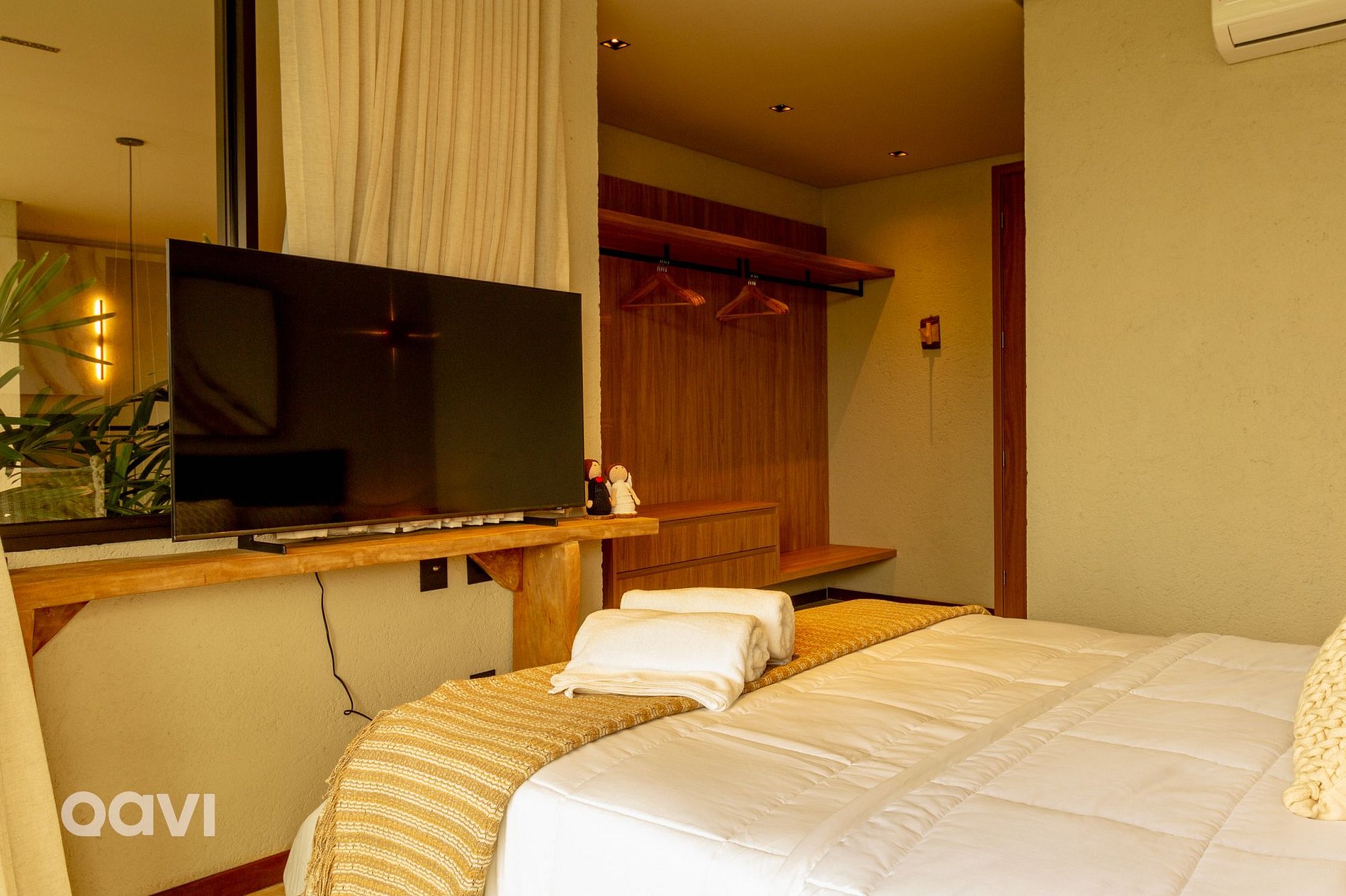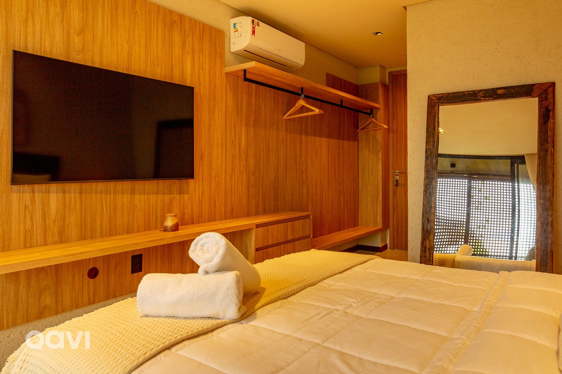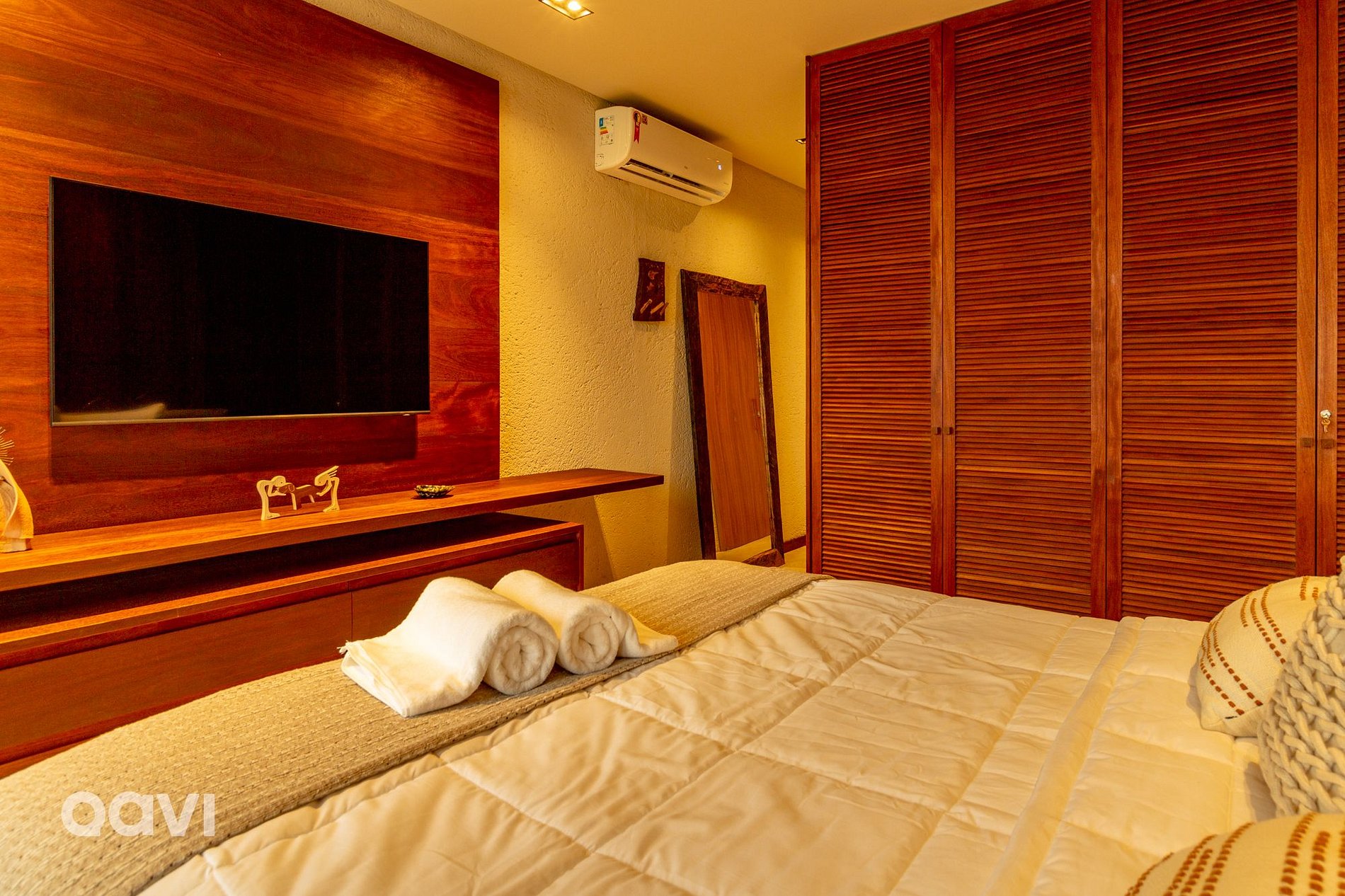 • Suíte 2: cama de casal, ar-condicionado, televisão smart tv, espelho de corpo inteiro, aparelhos decorativos e banheiro com utensílios básicos;