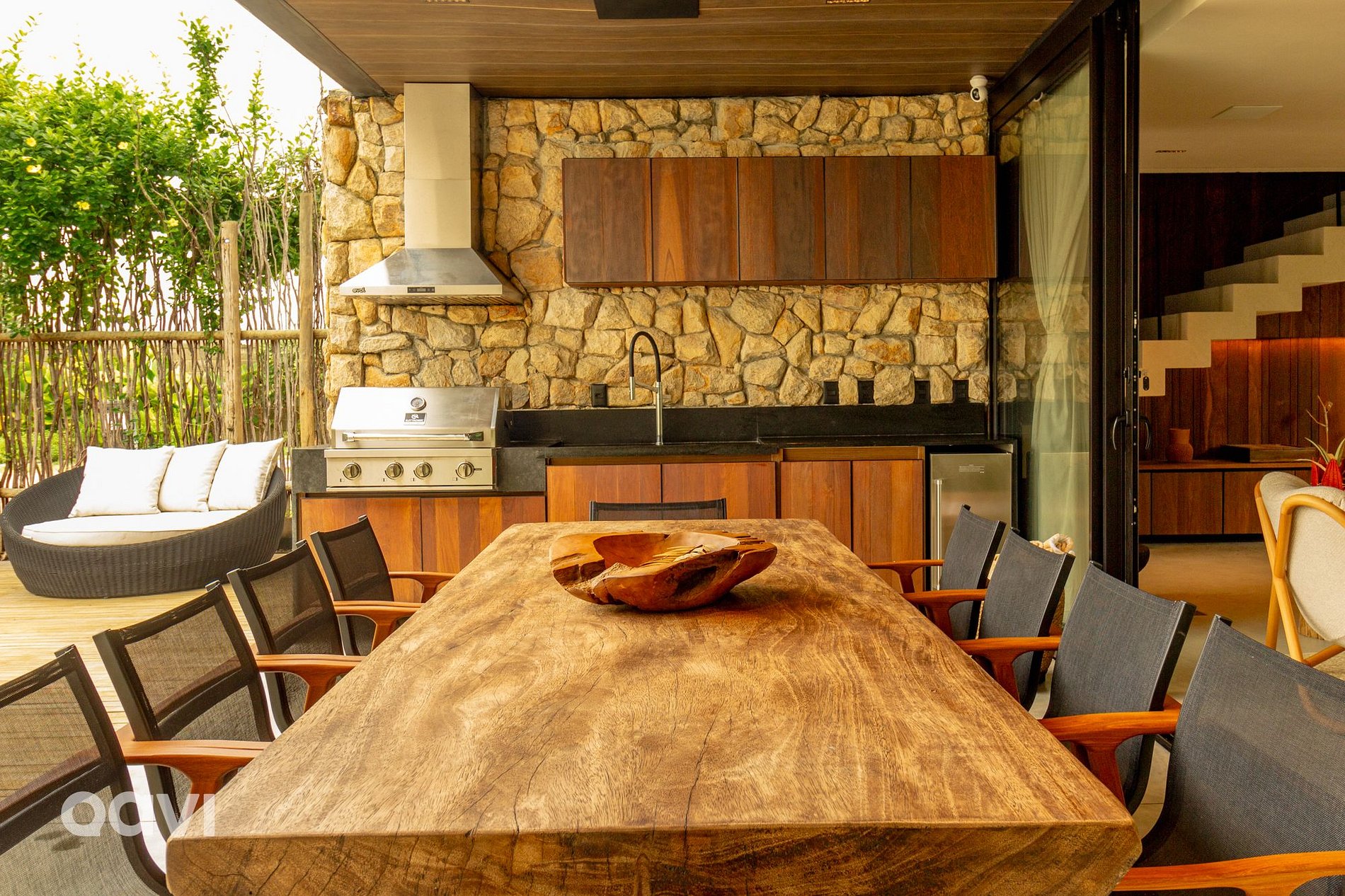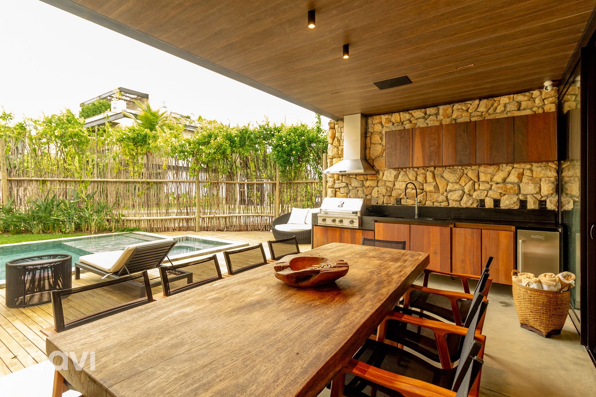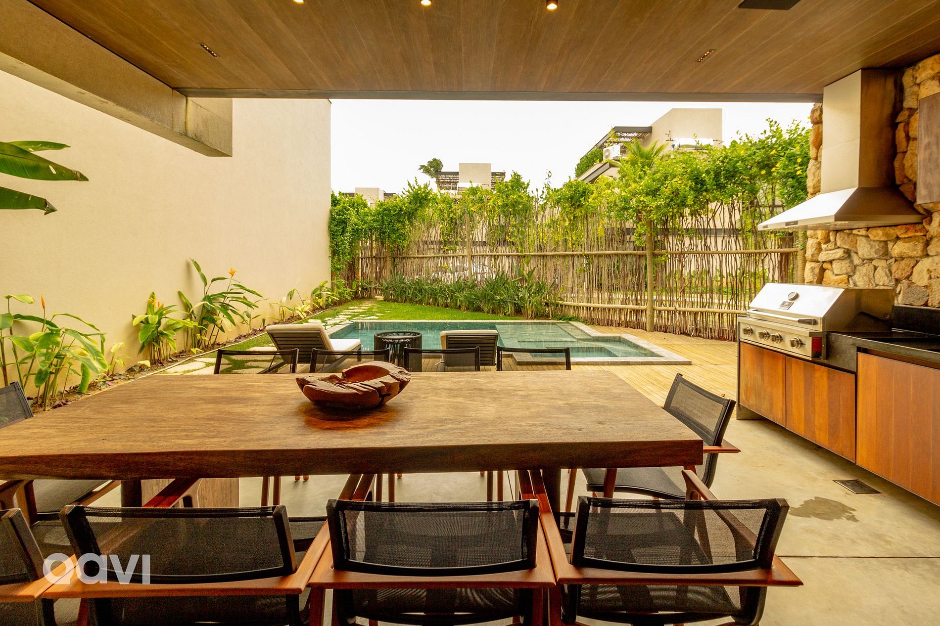 • Área de lazer: piscina, cadeiras, churrasqueira, meda de 10 lugares e divãs.
