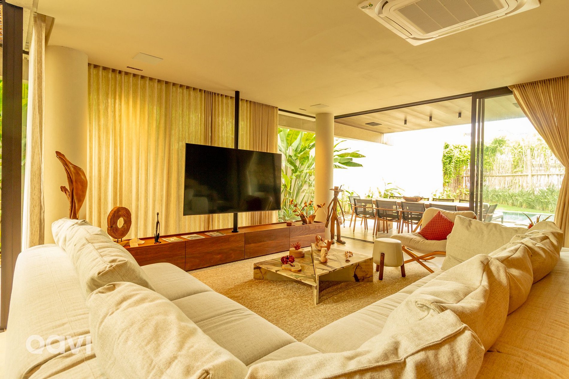 • Sala de TV: Televisão (Smart-TV), sofá, poltrona de madeira, rack.