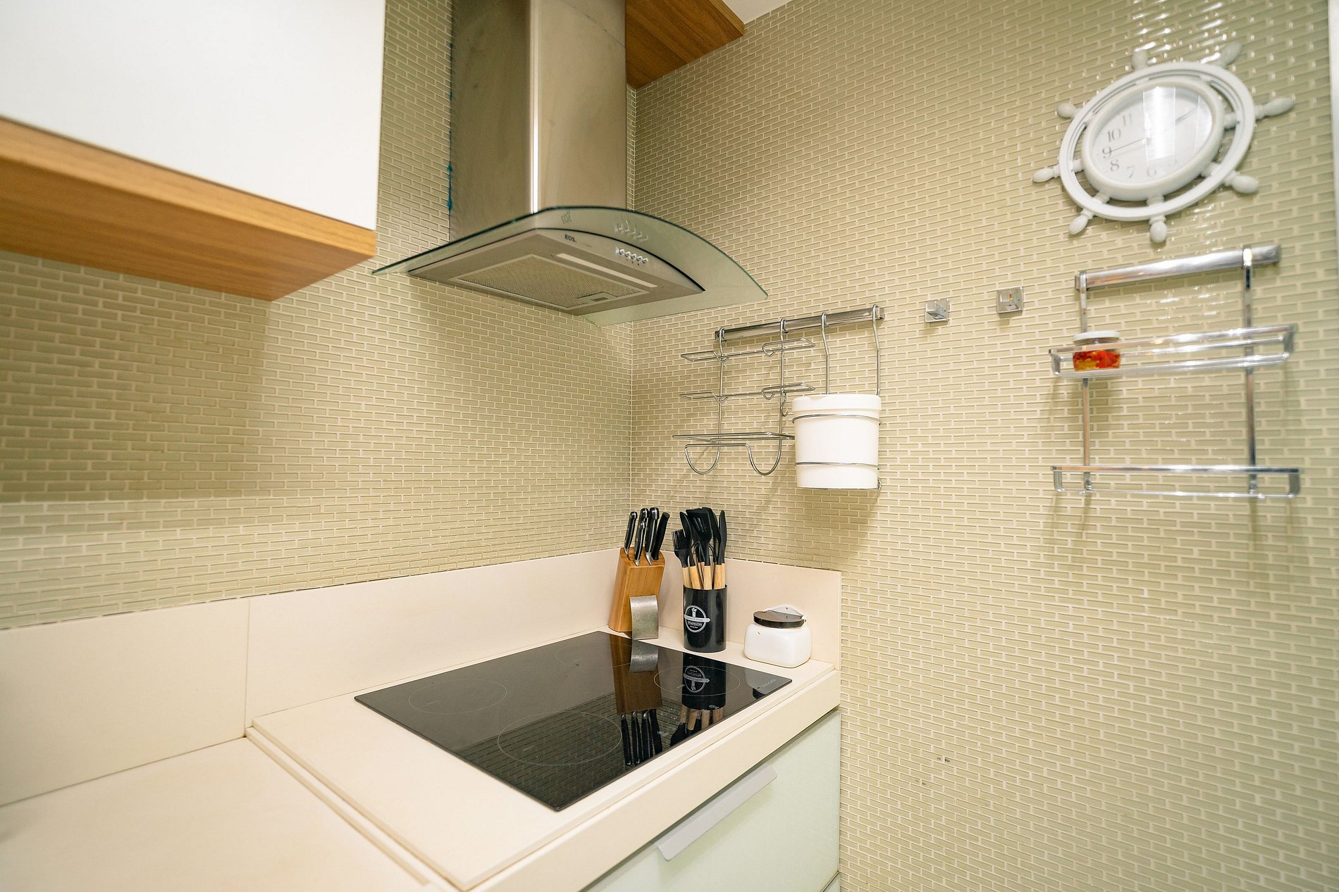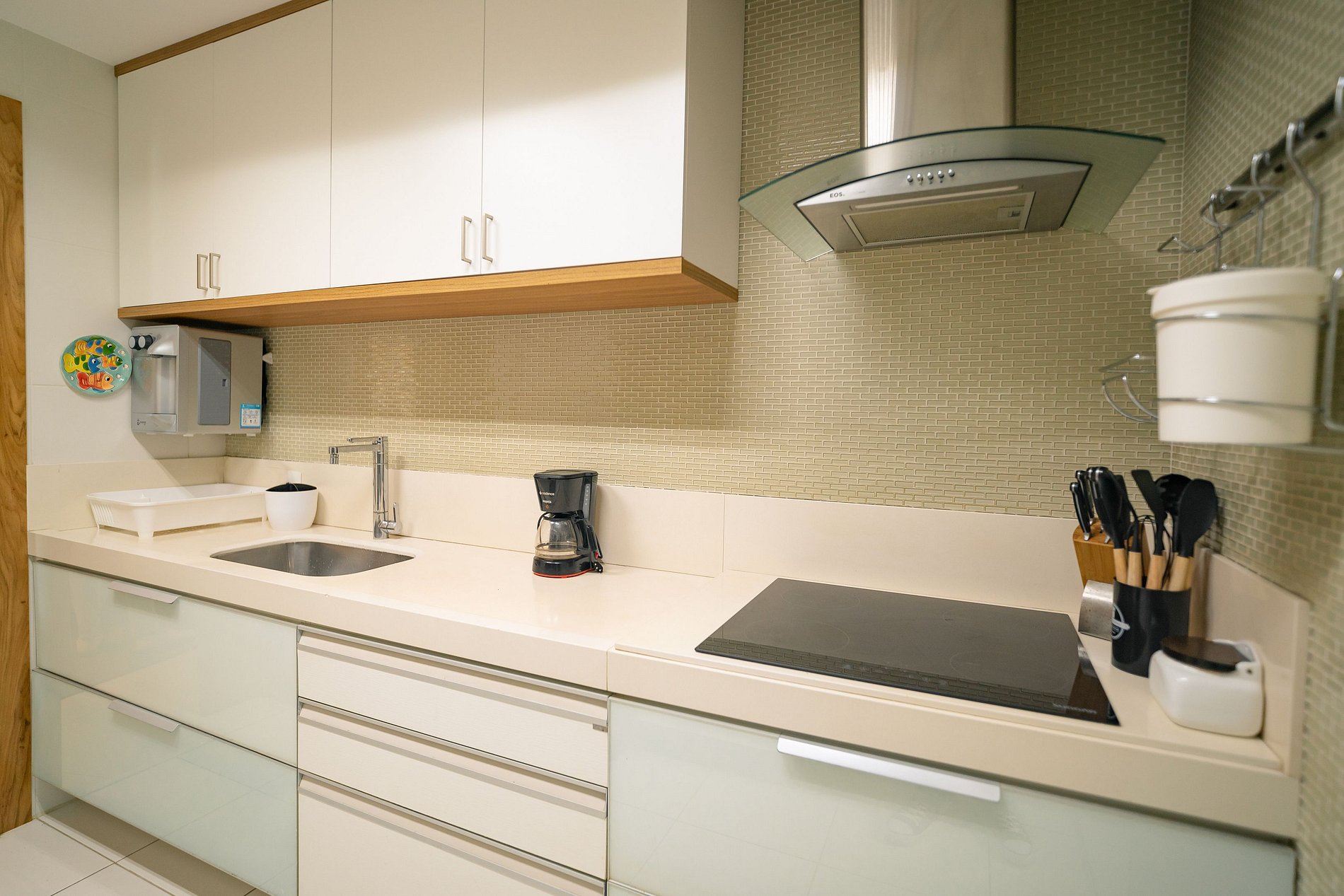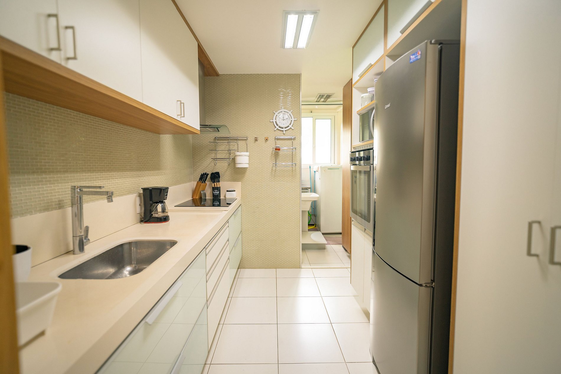 Geladeira duplex, micro-ondas, forno, cooktop por indução, utensílios variados (panelas, talheres, copos e taças).