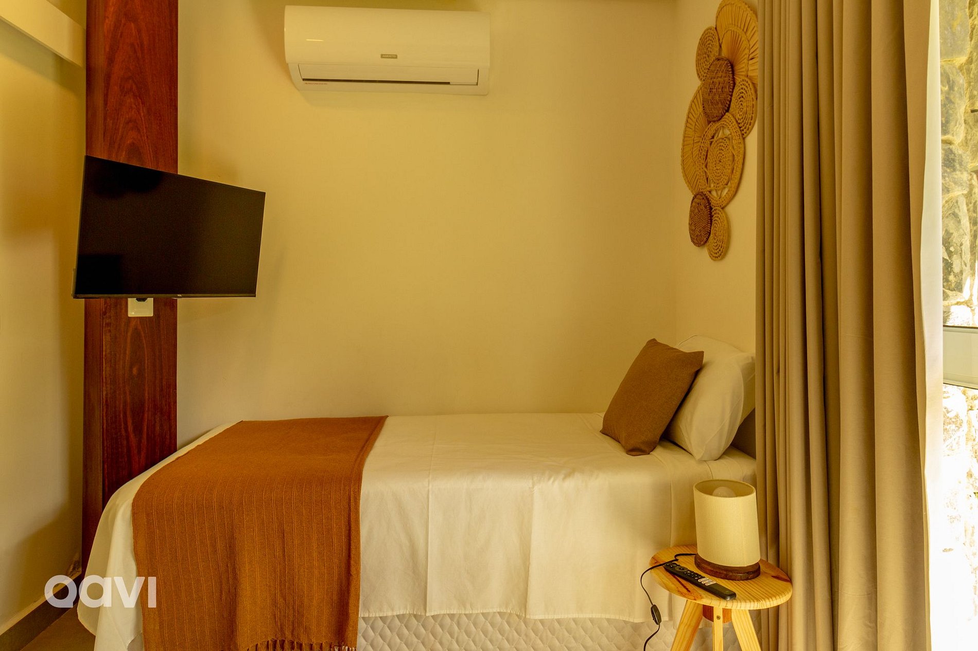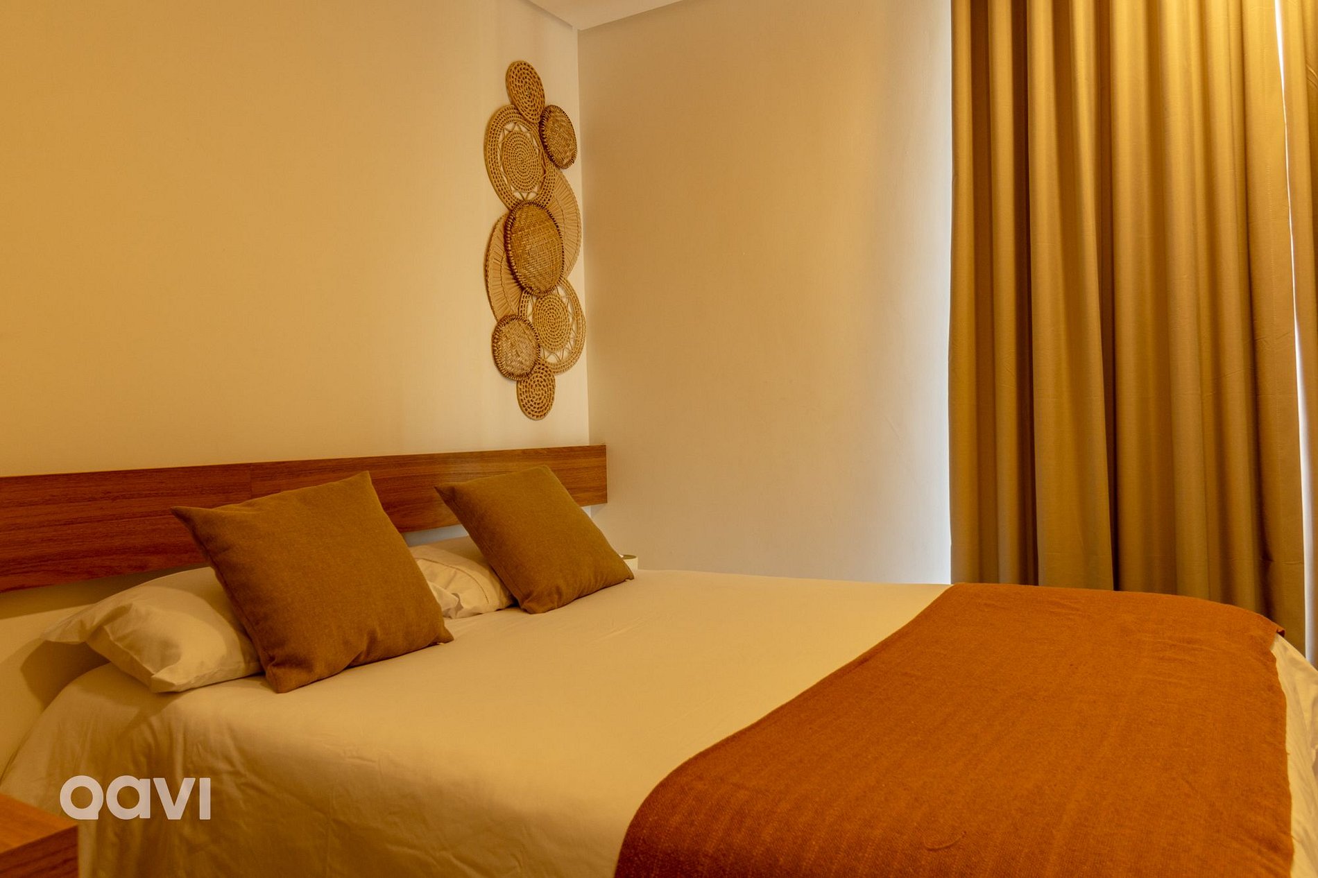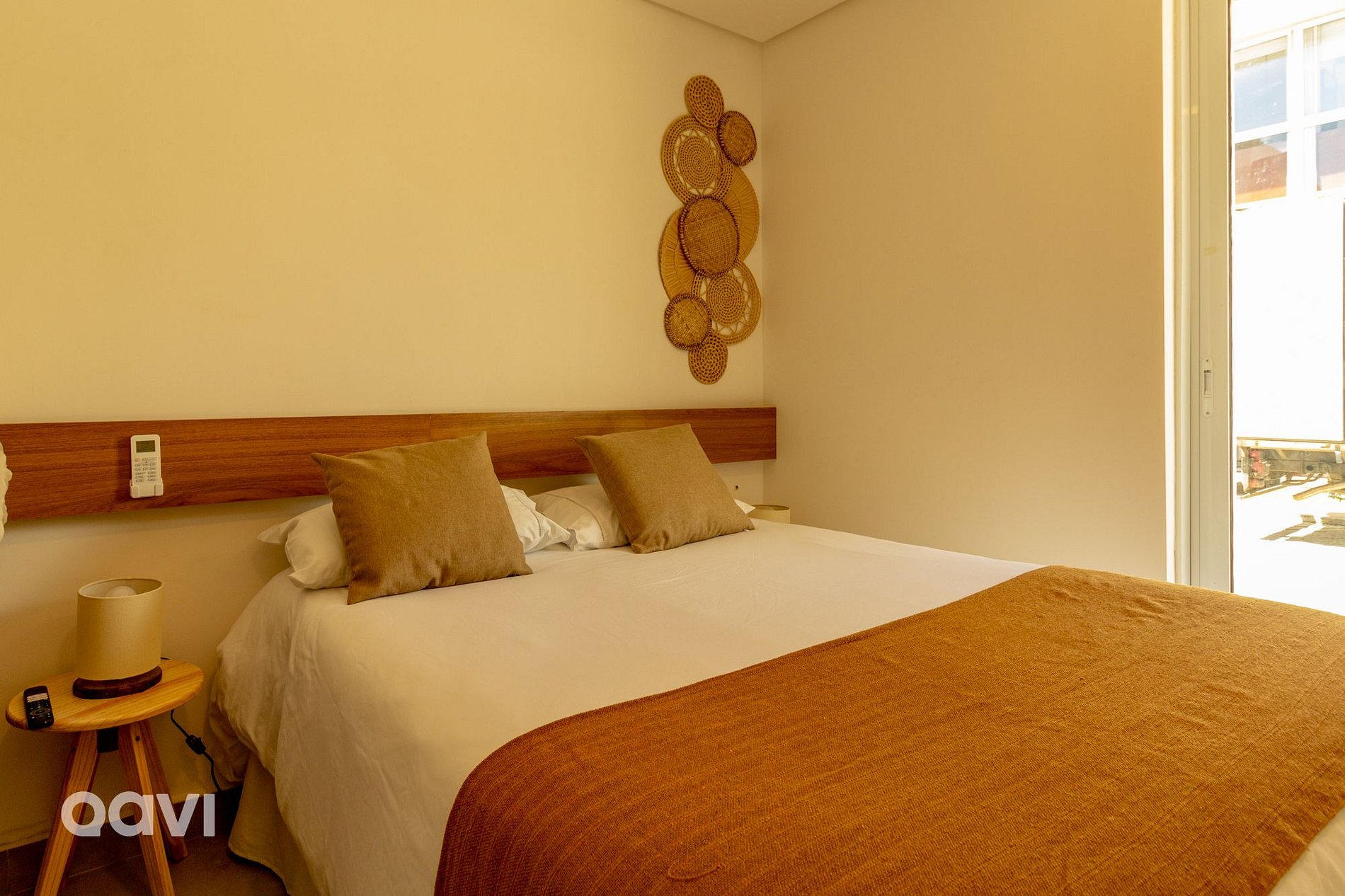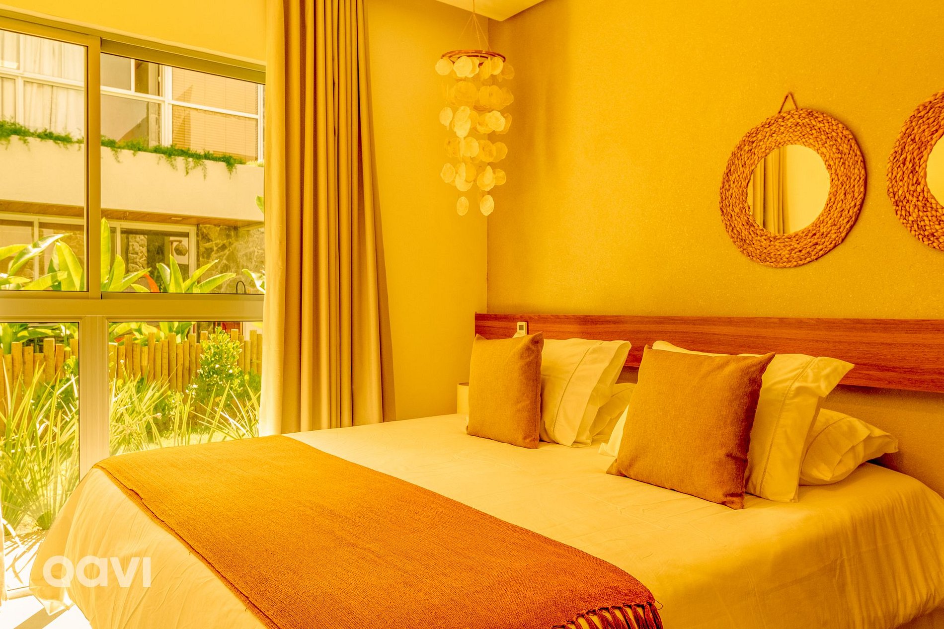 • Suíte 2: cama de casal, itens decorativos, ar-condicionado e banheiro com utensílios básicos;