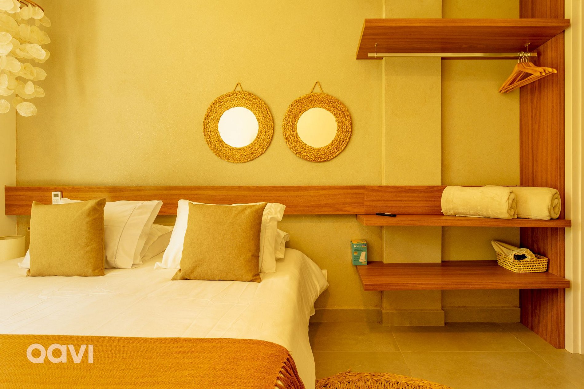 • Suíte 1: cama de casal + 1 auxiliar de solteiro, ar-condicionado, aparelhos decorativos e banheiro com utensílios básicos;