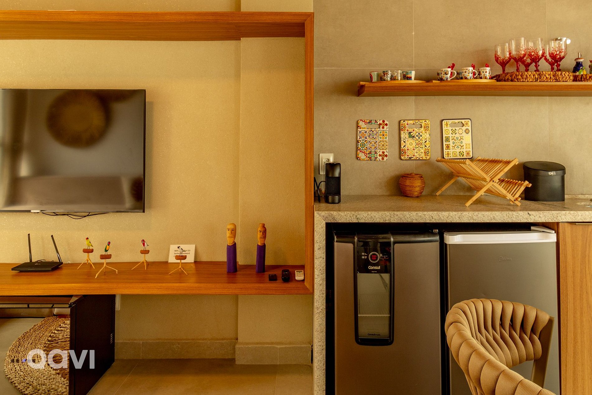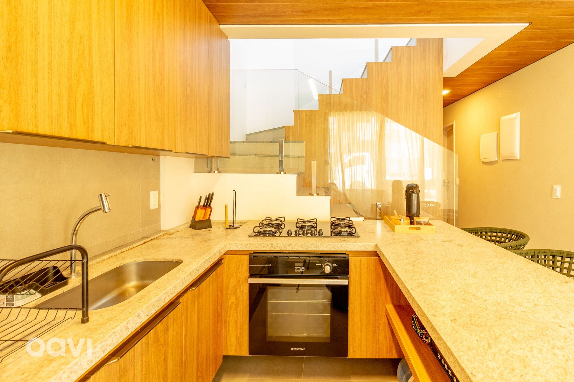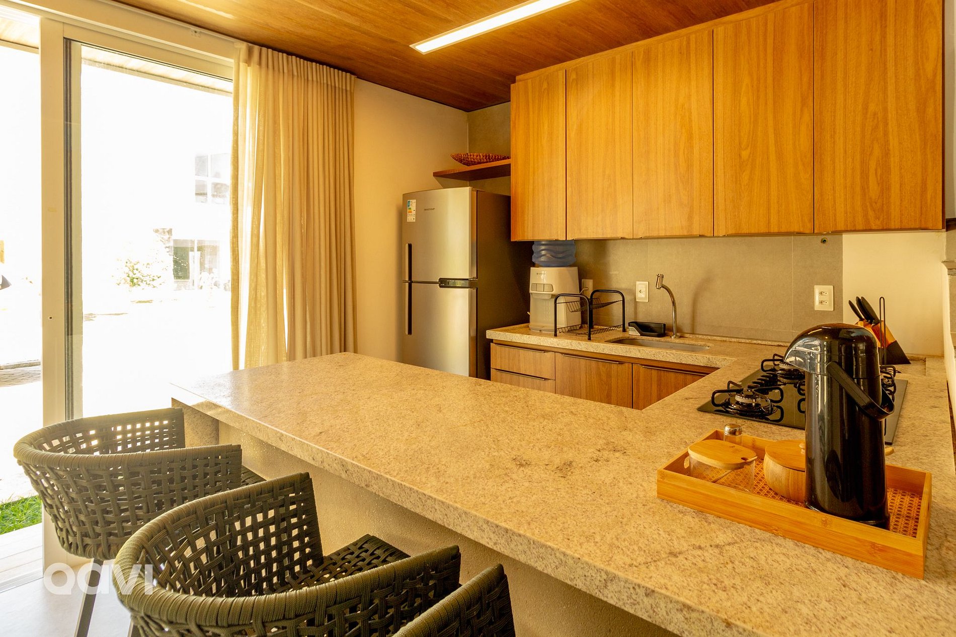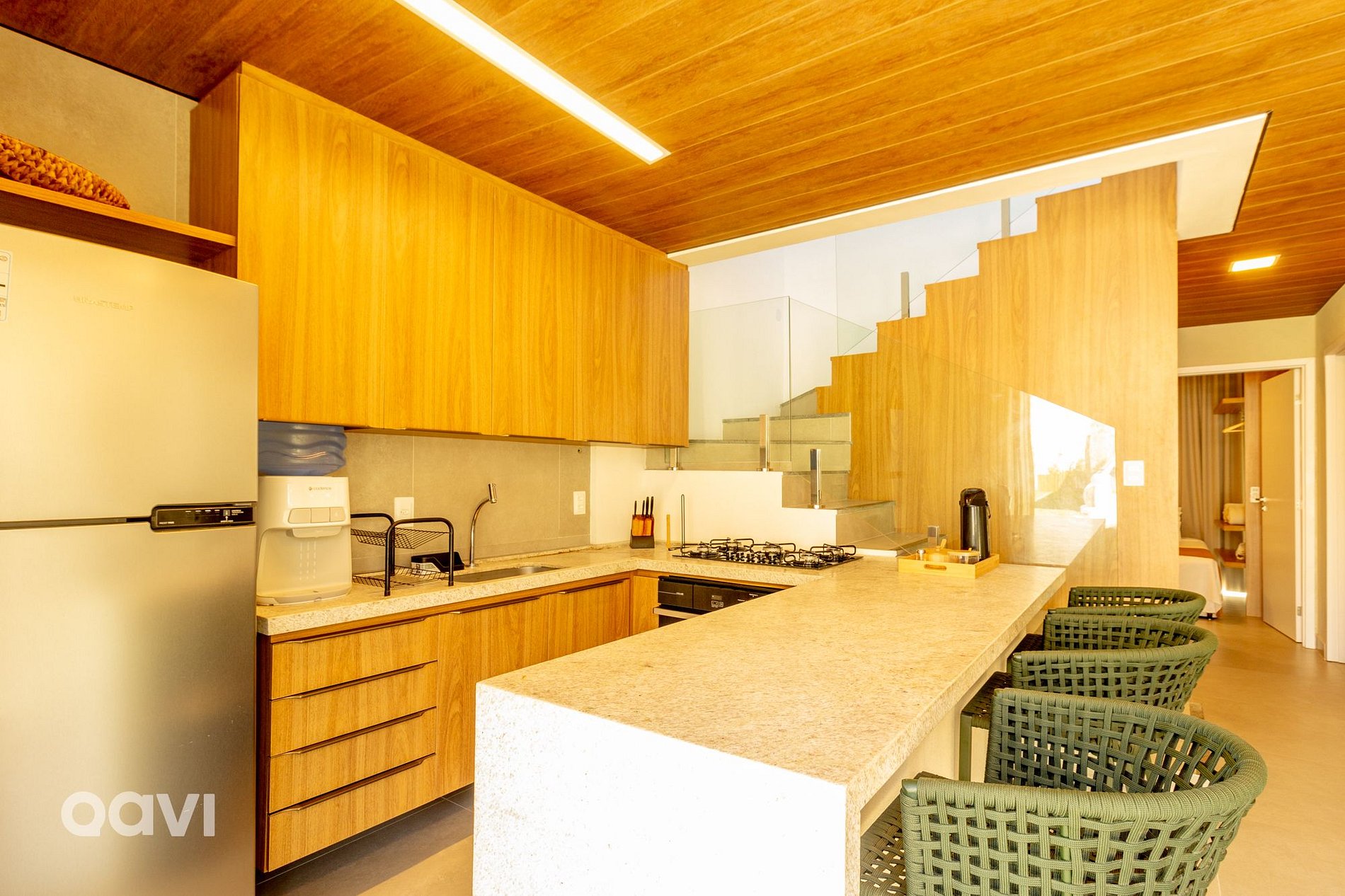• Cozinha térrea: utensílios completos (talheres, xícaras, panelas, pratos e copos), geladeira, cafeteira, sanduicheira, liquidificador, aparelhos de servir e armários;