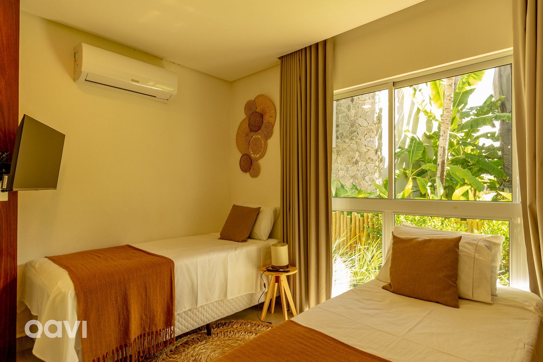 • Suíte 3: 2 camas de solteiro + 1 auxiliar de solteiro, ar-condicionado, itens decorativos e banheiro com utensílios básicos;