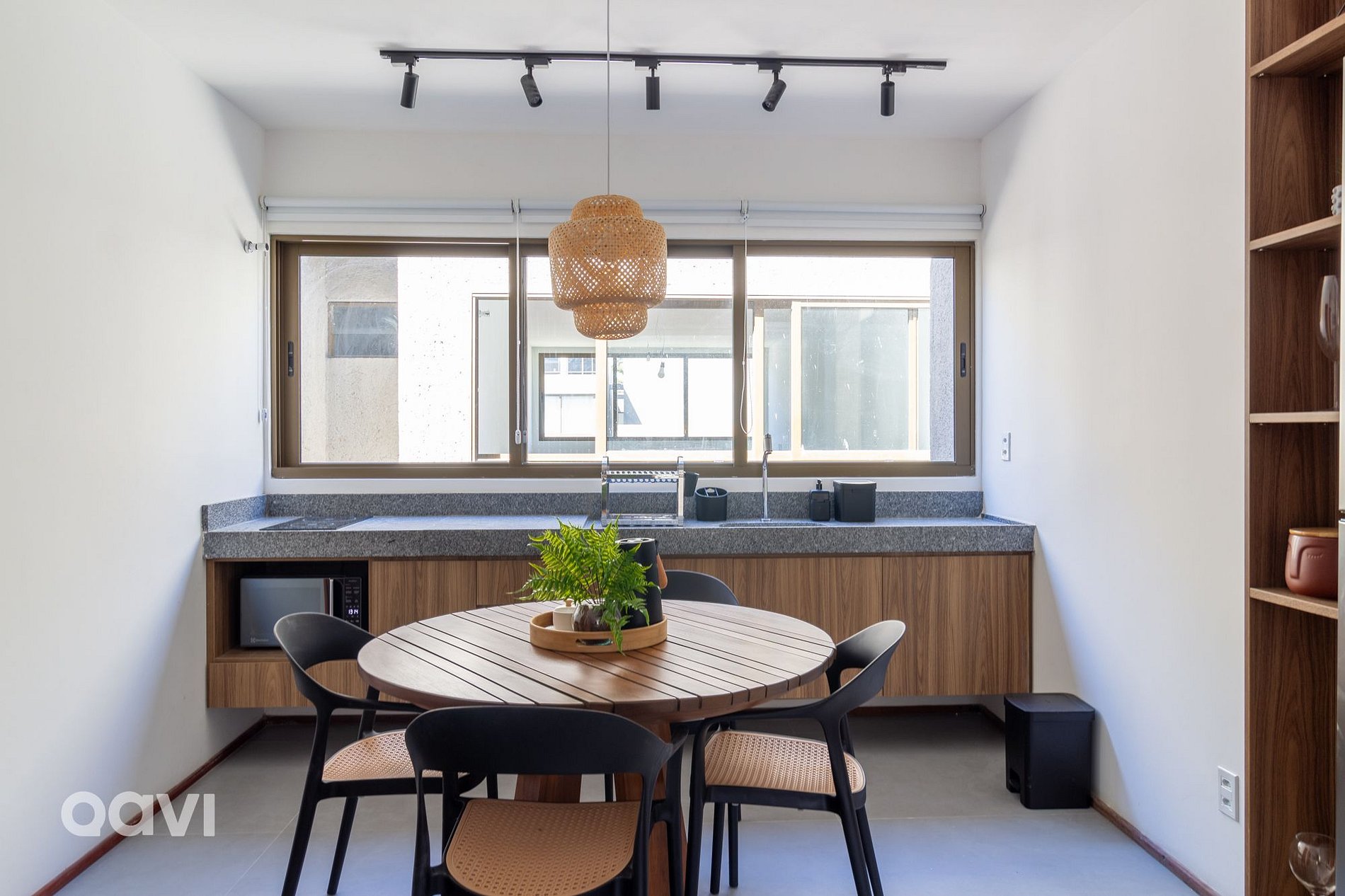 • Cozinha: mesa para 4 pessoas, fogão, geladeira, micro-ondas, louças, panelas, talheres e copos.