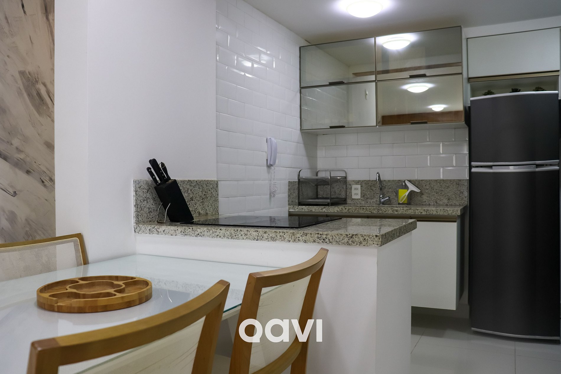 - Cozinha: cozinha integrada com a sala, mesa com 4 cadeiras, geladeira com freezer, micro-ondas, liquidificador, cooktop elétrico 4 bocas, cafeteira, sanduicheira e demais utensílios de cozinha (pratos, talheres, panelas, copos e taças);