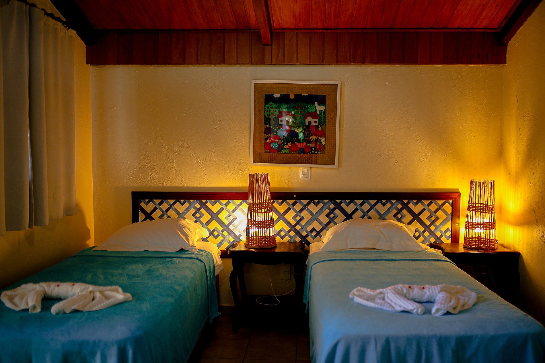 - Quarto com 1 cama de casal ou 2 camas de solteiro, mesa de cabeceira e luminária e banheiro com aquecimento solar.