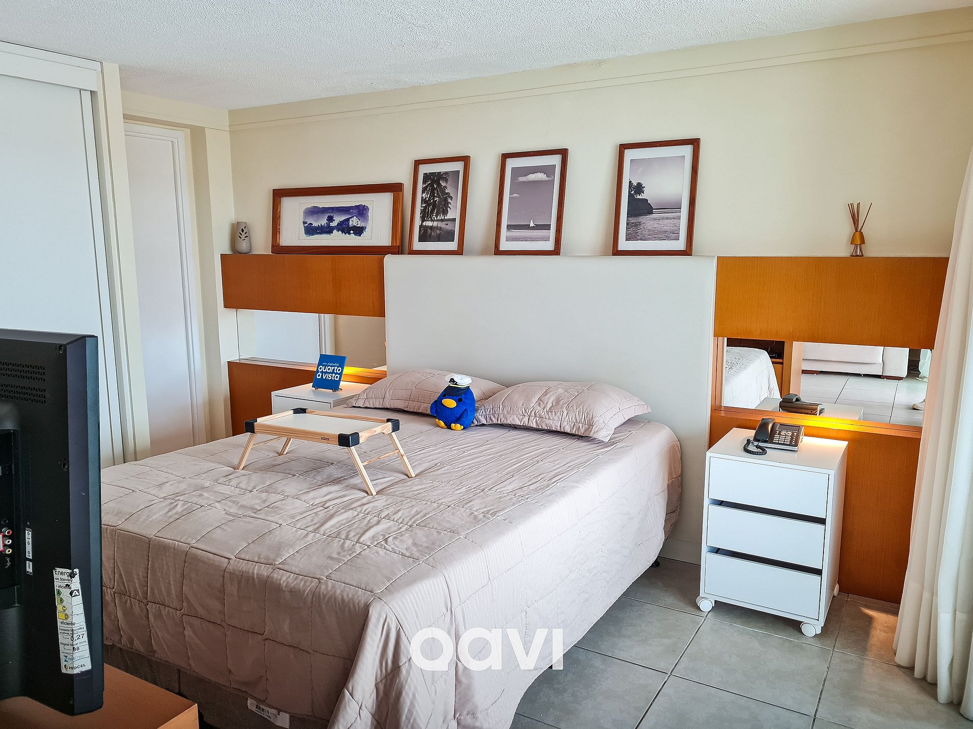 - Suíte: Cama Queen de casal, ar-condicionado, mesas de cabeceira, TV, guarda roupa , sofá-cama casal e banheiro completo.