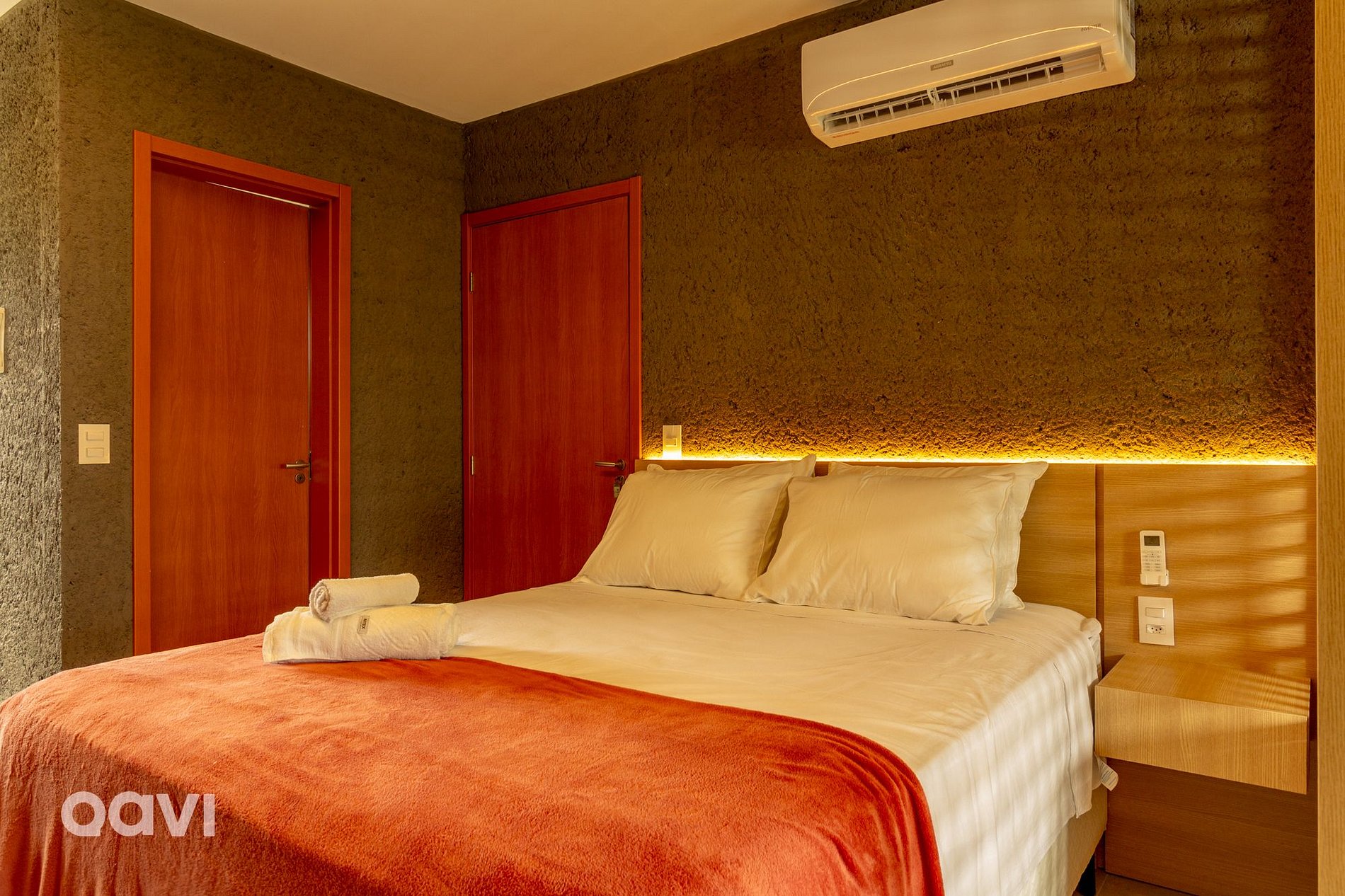 • Uma cama de casal, ar-condicionado, televisão e sofá;