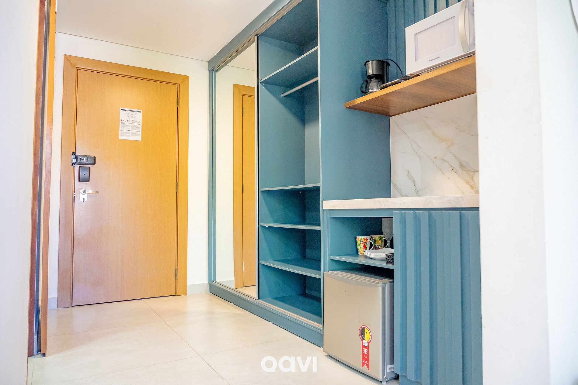 • Cozinha Gourmet: Frigobar + micro-ondas, torradeira, Cafeteira elétrica e kit completo de utensílios (talheres, pratos e copos, cutelaria);