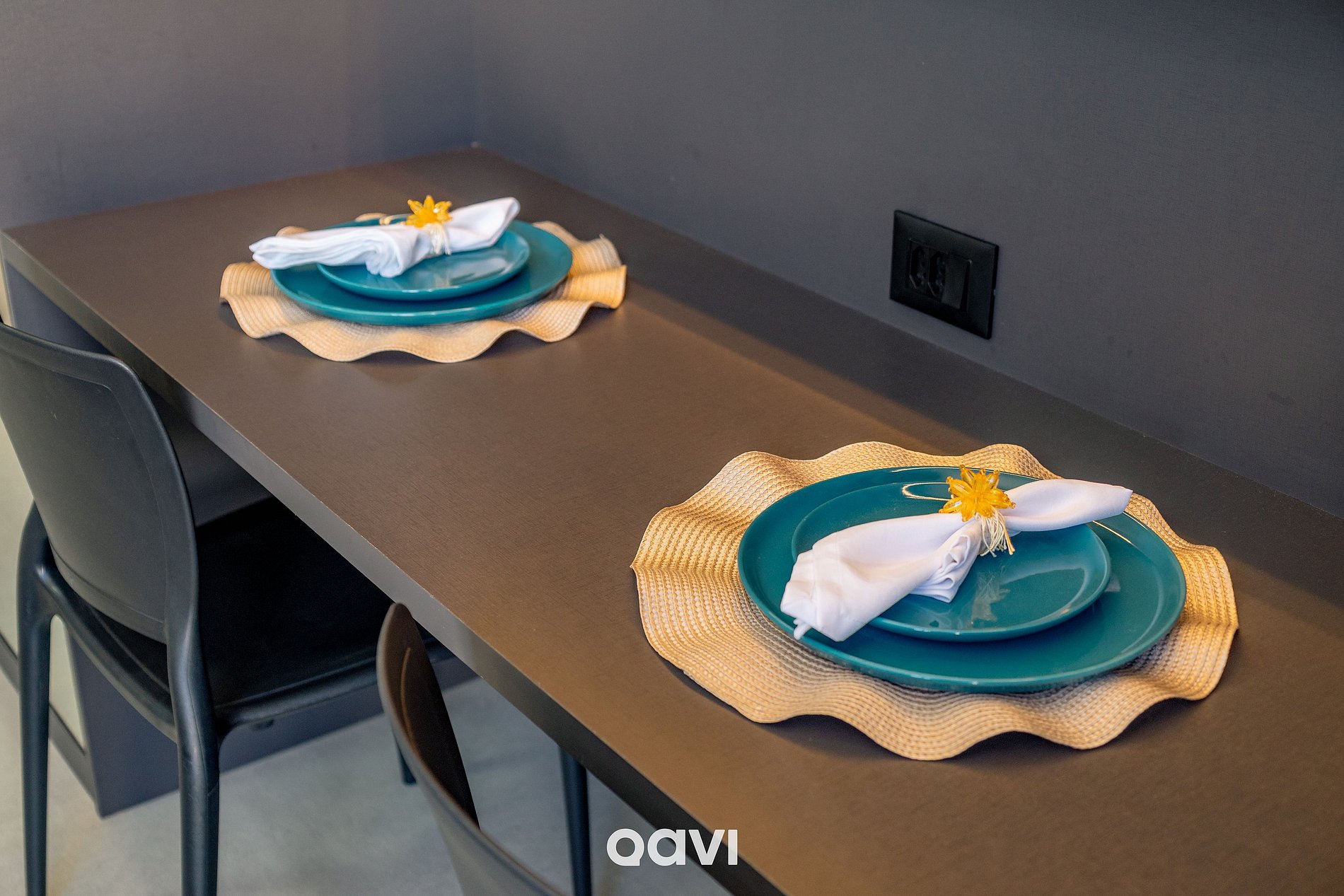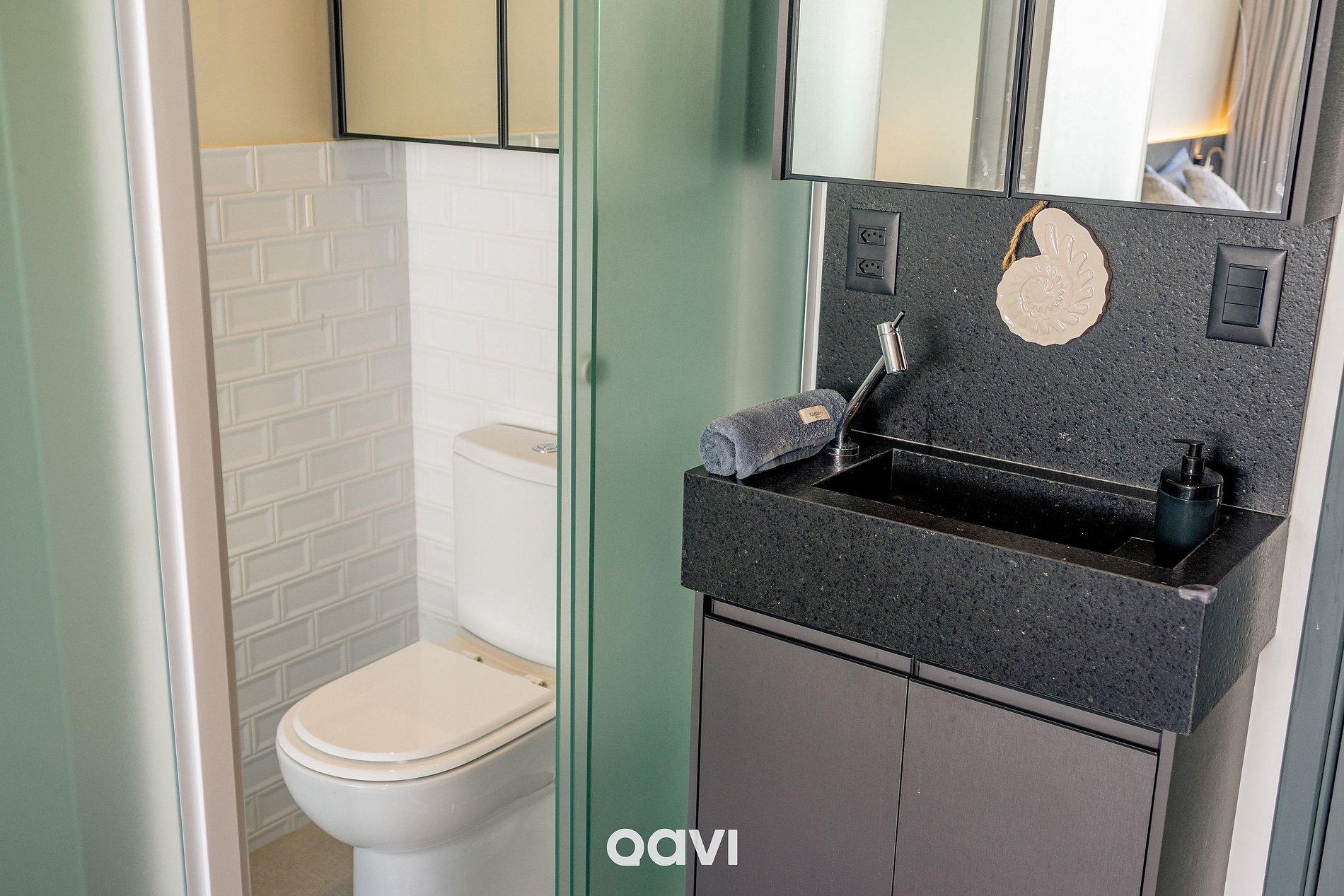 - Cozinha: Micro-ondas e frigobar, Air fryer, sanduicheira, liquidificador, cafeteira elétrica e utensílios básicos (talheres, copos e taças);