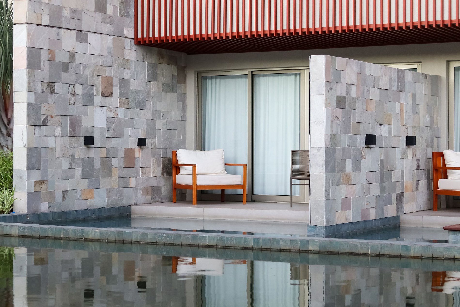 Varanda: Espelho d'água com poltrona e mesa com cadeiras.
