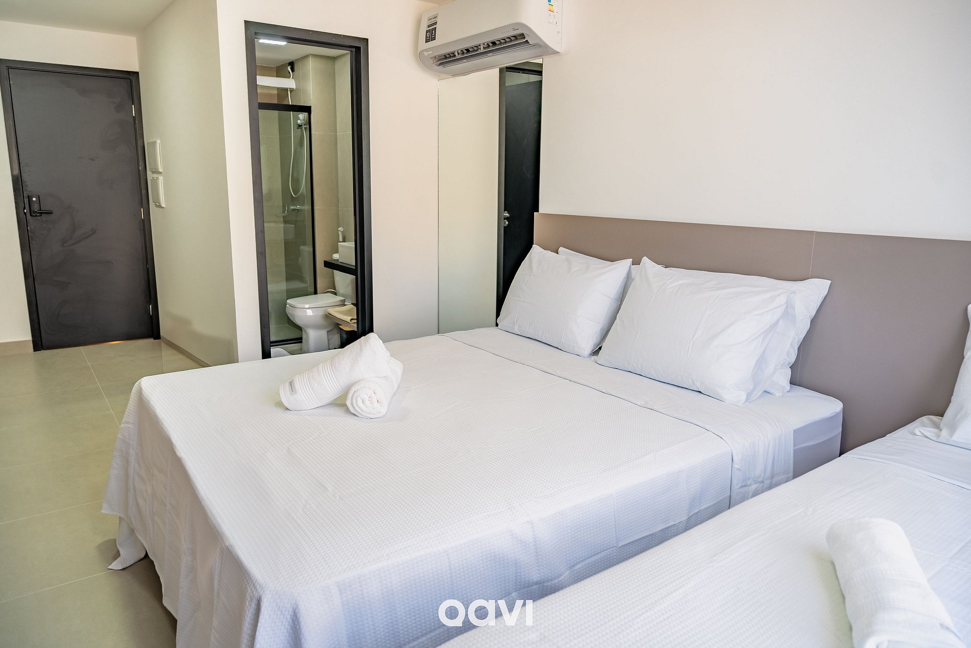 Suíte: uma cama queen, uma cama de solteiro, ar-condicionado, armário e banheiro completo.