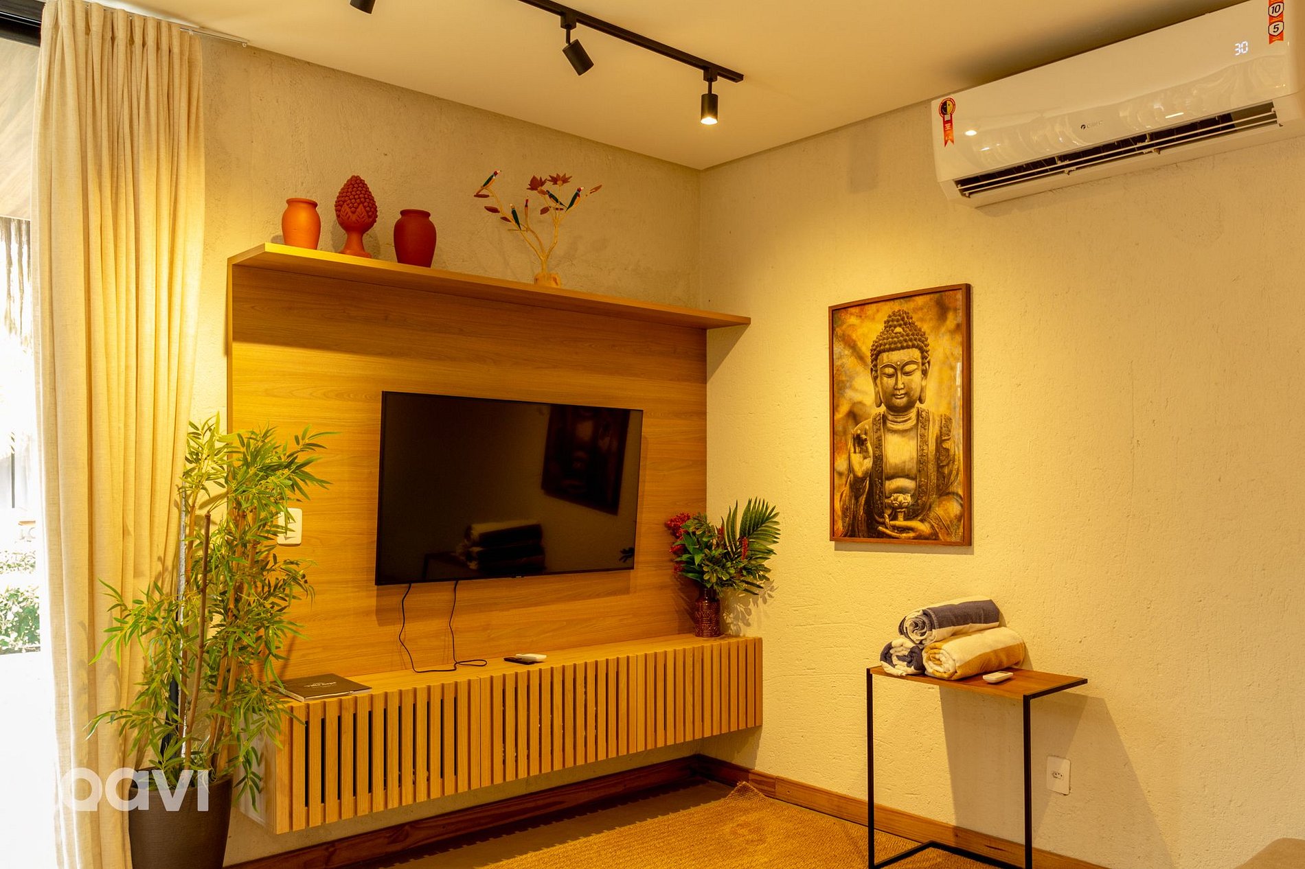 • Sala: espaço amplo com ambiente integrado, sofá-cama e televisão Smart, ilha para refeições e integração com a cozinha;