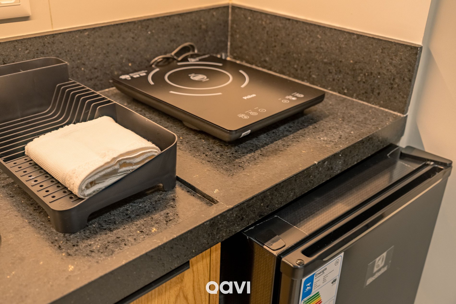 Cozinha compacta: equipada com fogão por indução, frigobar, microondas, cafeteira, sanduicheira e utensílios básicos (panelas, copos, taças e talheres).