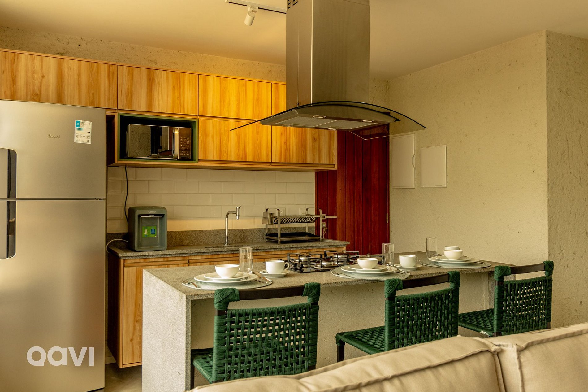 -Sala: Espaço amplo com ambiente integrado, sofá-cama e televisão Smart, ilha para refeições e integração com a cozinha;