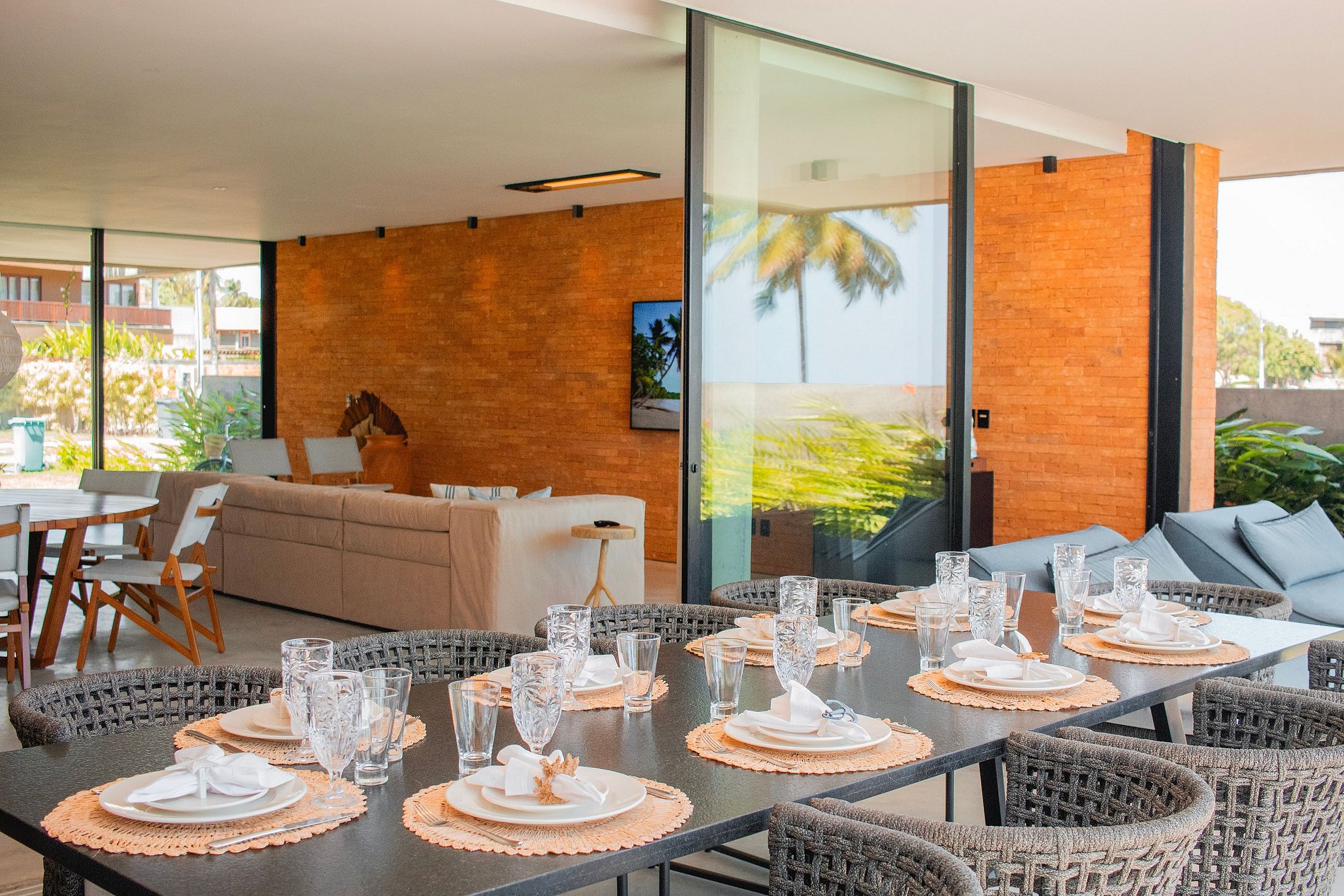 •Sala de TV e estar: smart tv, sofá, poltrona de madeira, rack, mesa com 12 lugares;