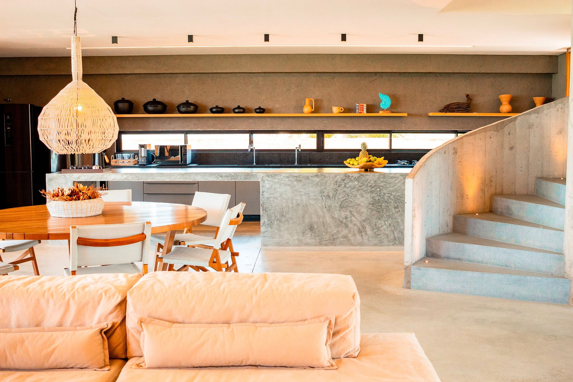 •Sala de TV e estar: smart tv, sofá, poltrona de madeira, rack, mesa com 12 lugares;