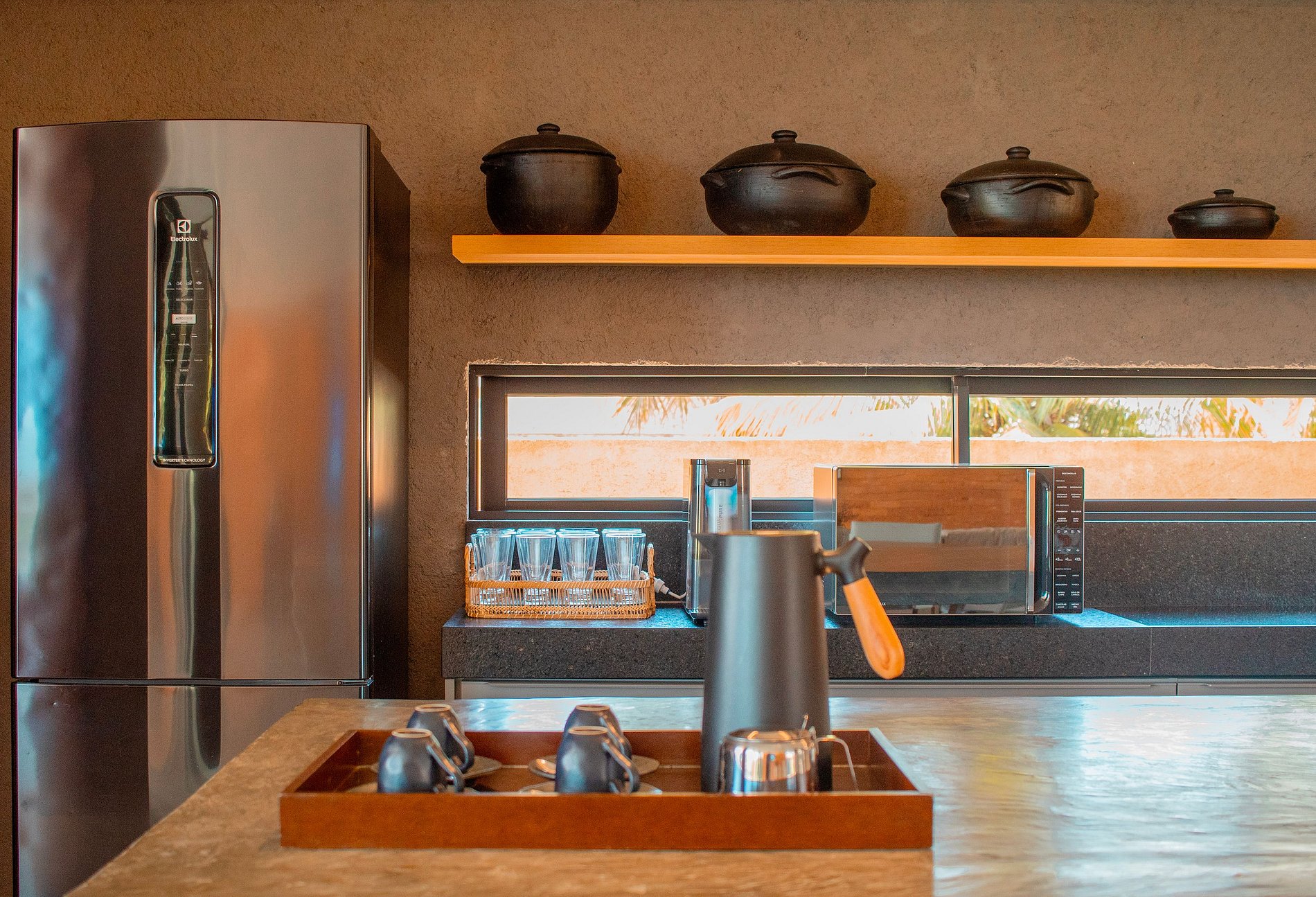 • Cozinha: utensílios completos (talheres, xícaras, panelas, pratos e copos), geladeira, cafeteira, sanduicheira, liquidificador, aparelhos de servir e armários;