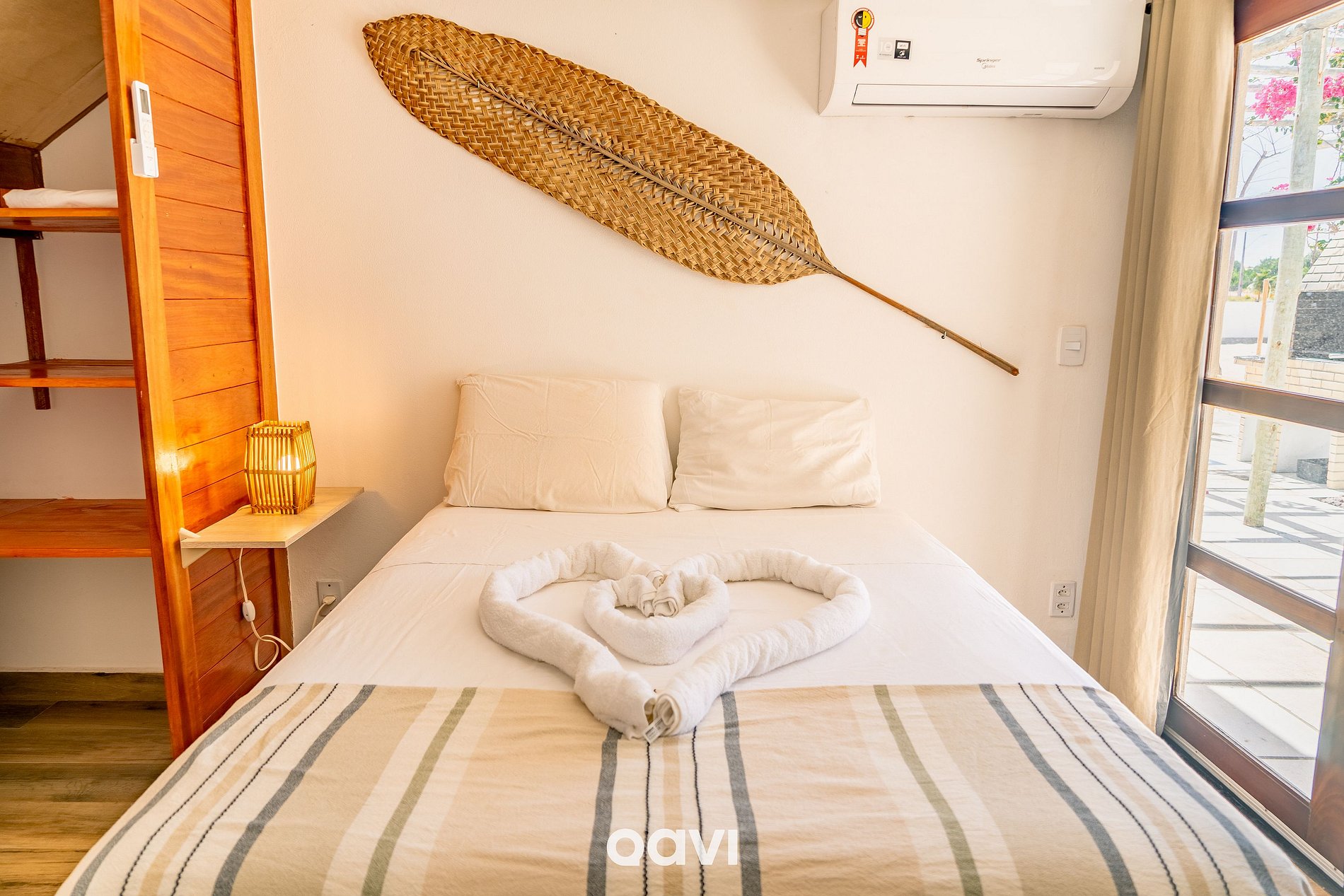 Quarto independente, com cama de casal, ar-condicionado, mesas de cabeceira e guarda-roupas;