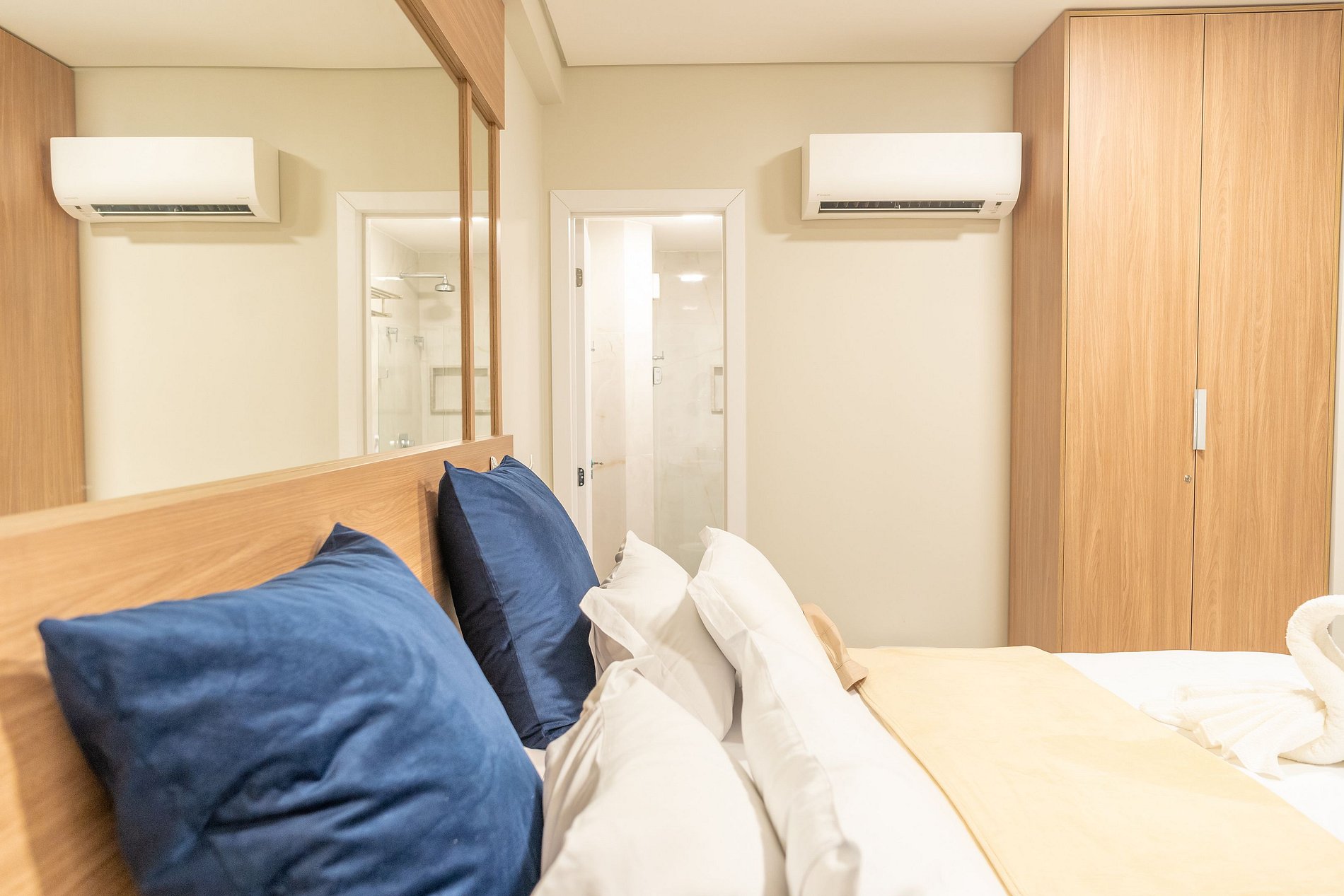 - Suíte 1: 1 cama de casal, armário, ar-condicionado, mesa de trabalho com uma cadeira e banheiro.