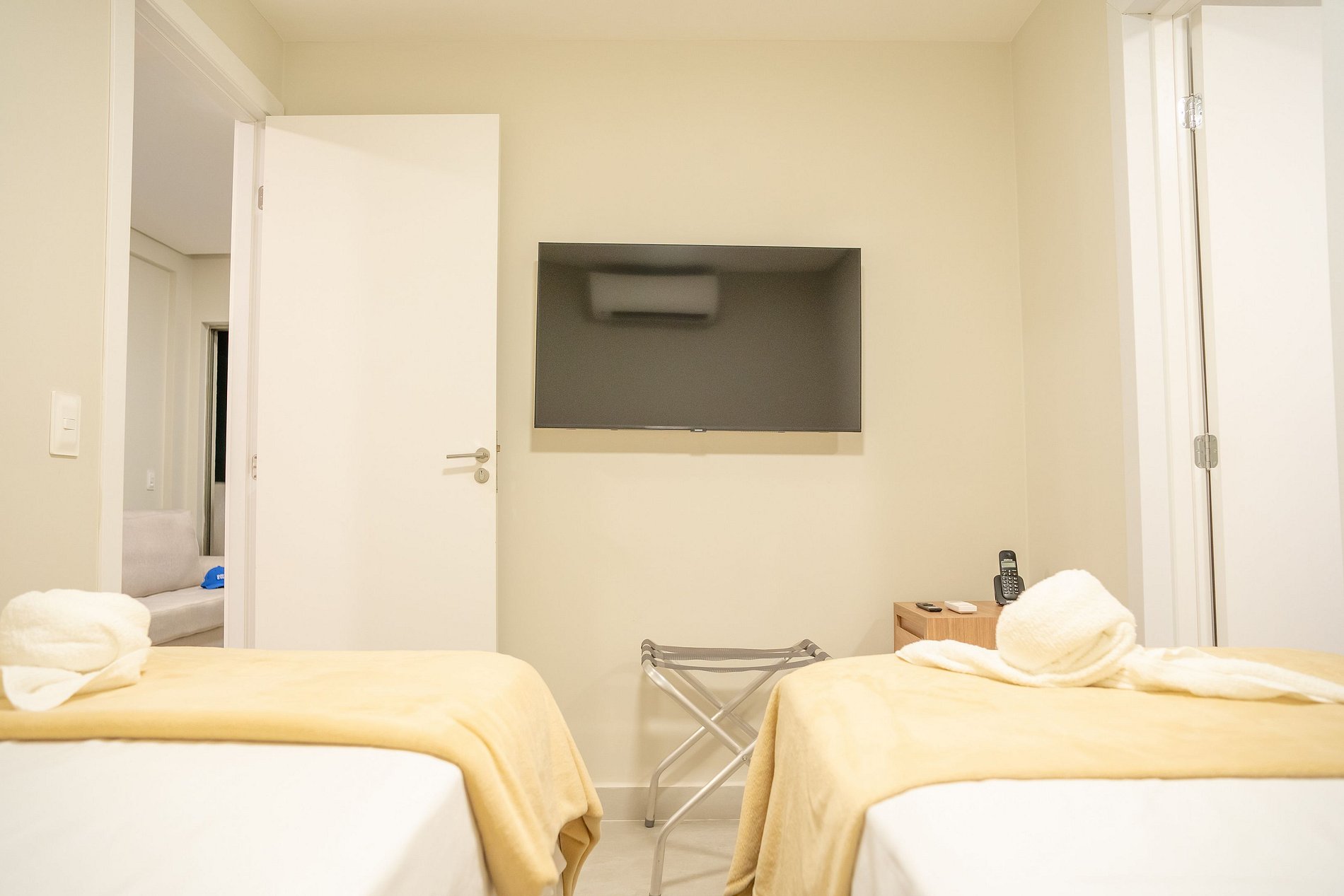 - Suíte 2: 2 camas de solteiro OU 1 cama de casal, ar-condicionado e banheiro.