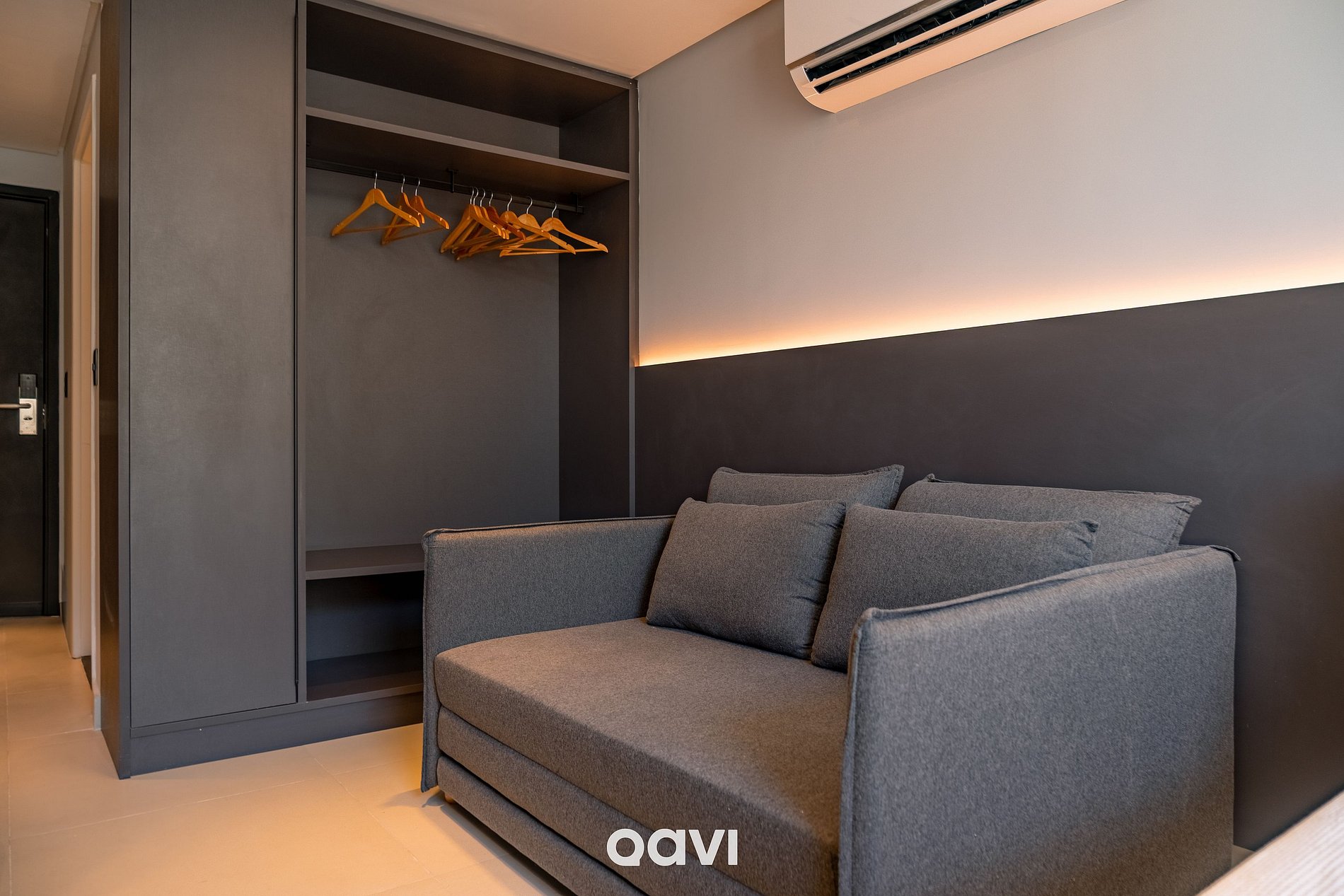 Quarto/Estúdio: cama de casal, sofá-cama de casal, smart TV, ar-condicionado e armário com cabides.