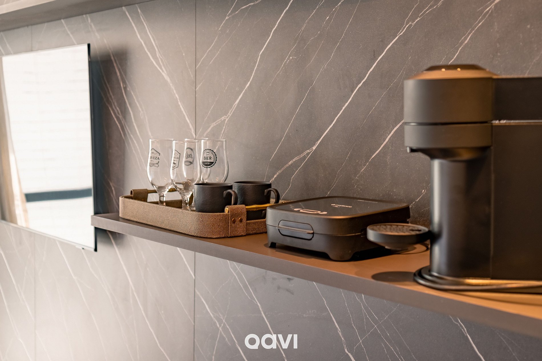 Cozinha integrada: equipada com sanduicheira, máquina de café, microondas, louças, copos, taças e talheres.