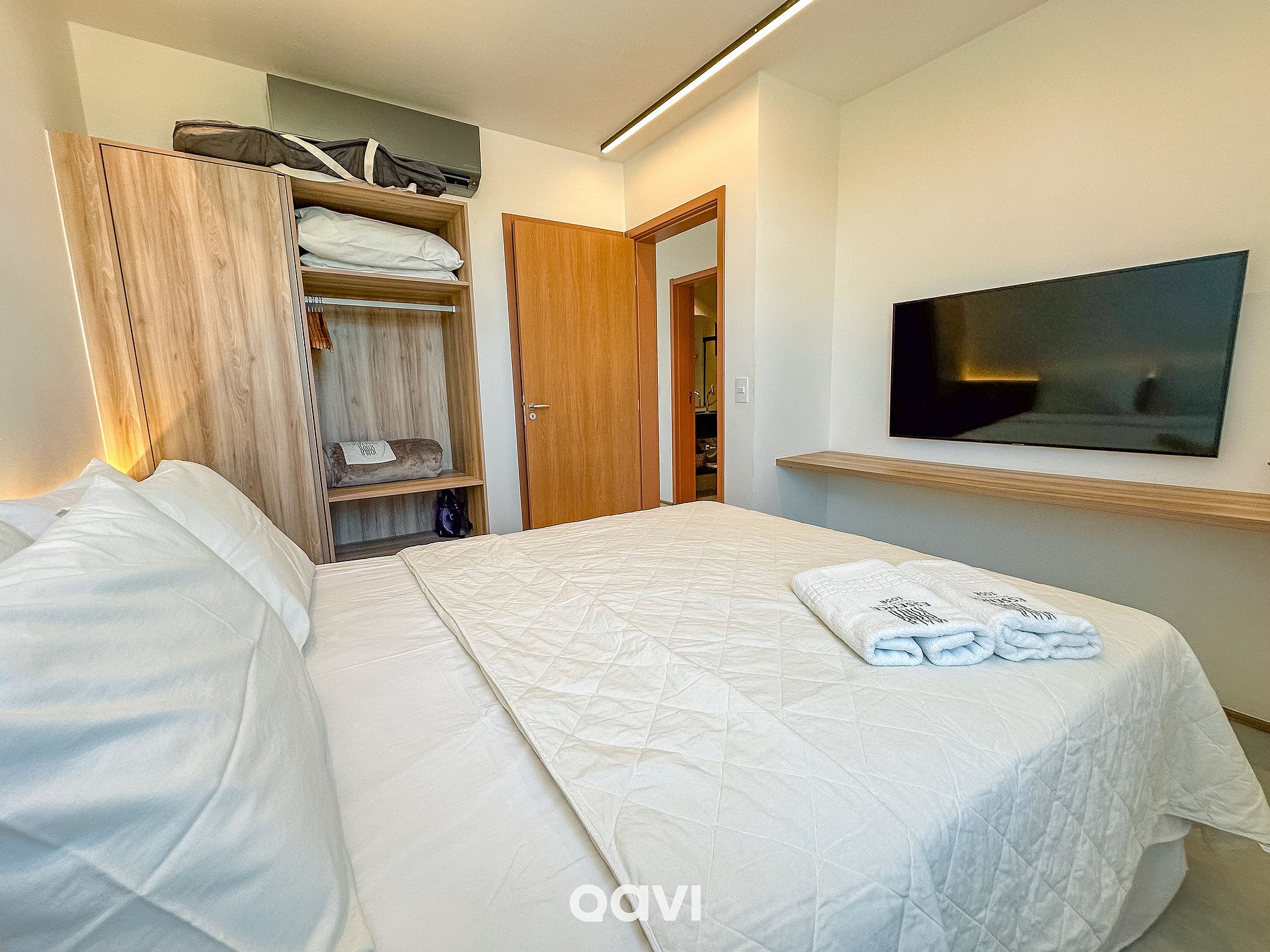 - Suíte 1: 01 cama queen, berço portátil, ar-condicionado, TV, armário com cabides e banheiro completo.