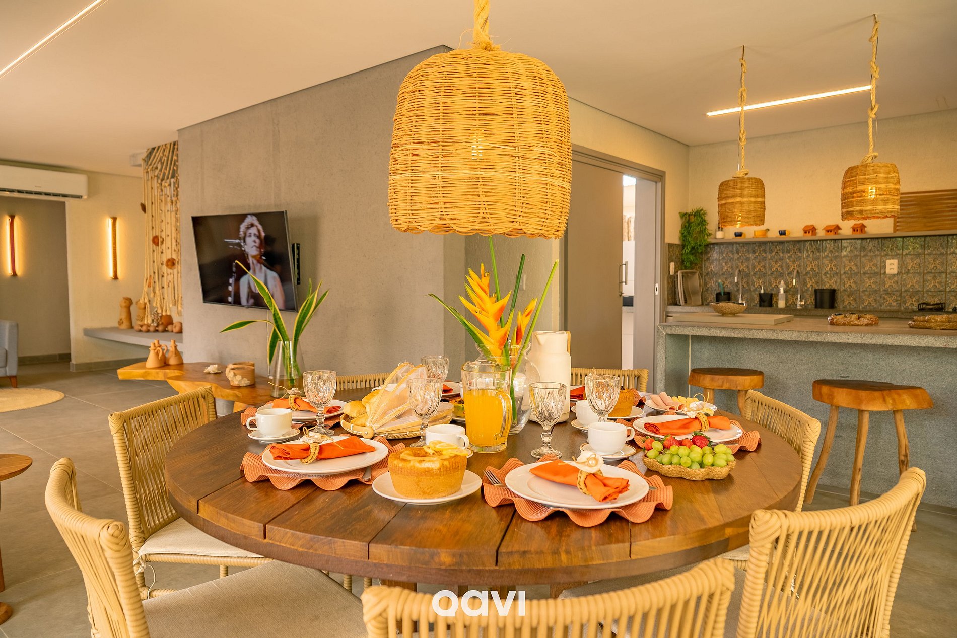 Sala: Espaço amplo com Sofá e televisão, mesa de jantar para 7 pessoas e poltrona.